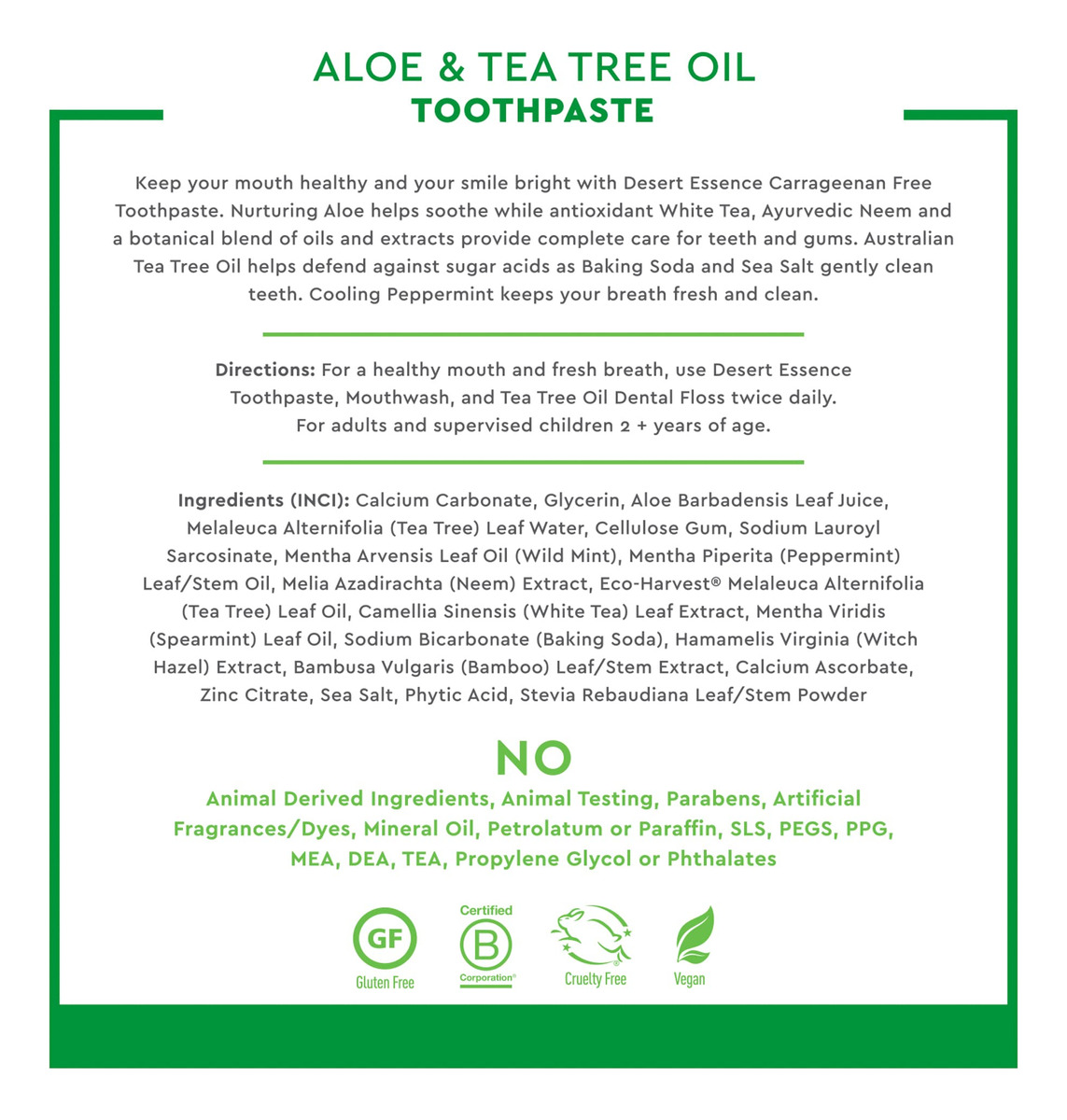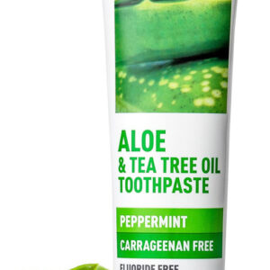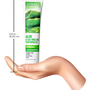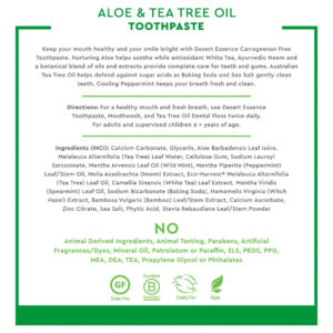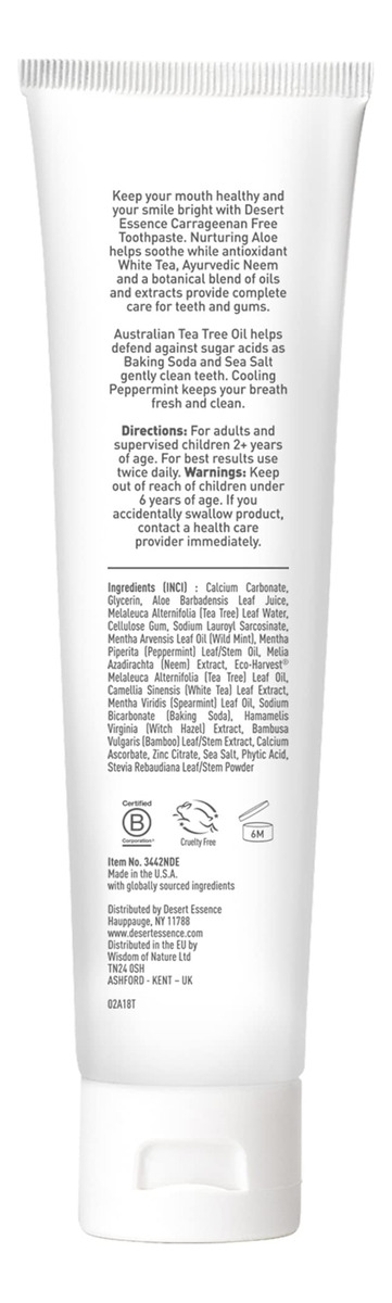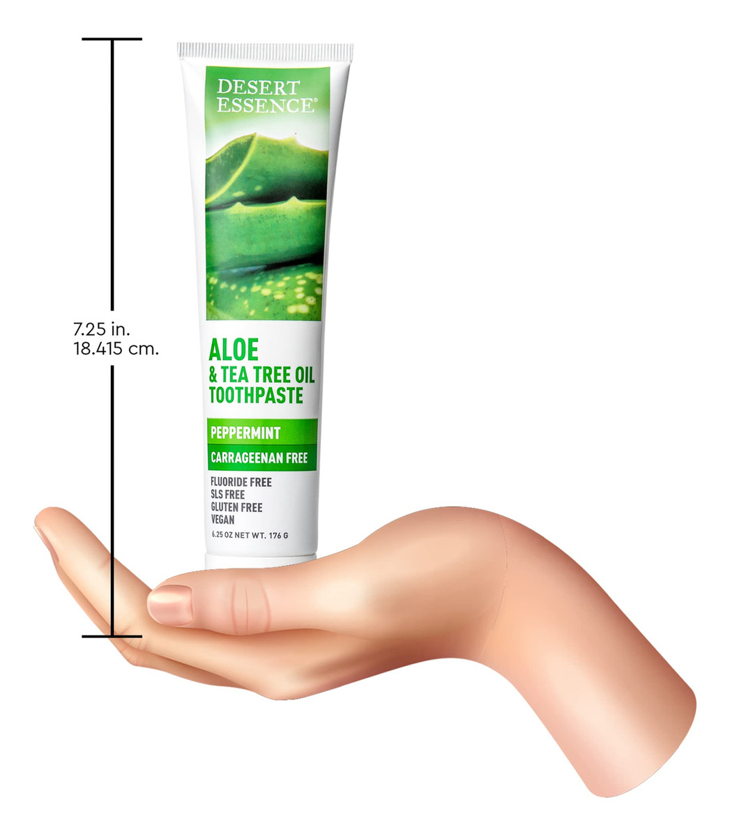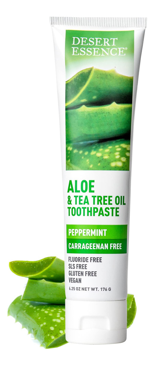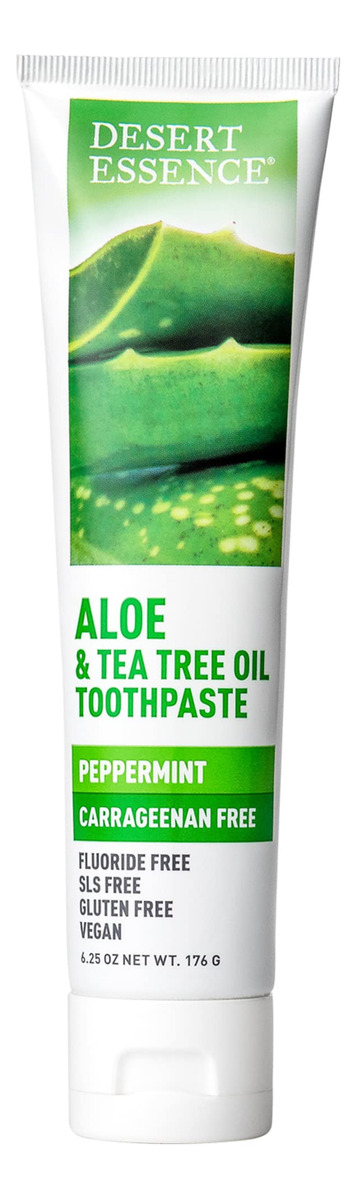 Pasta de dente de aloe e melaleuca Desert Essence sem carragenina de 6,5 onças – Não transgênica, sem glúten, vegana, sem crueldade, sem flúor – Óleo de melaleuca e neem de colheita ecológica – Combate os ácidos de açúcar formadores de cáries – Formulada sem flúor e carragenina, esta pasta de dente de aloe à base de plantas ajuda a manter dentes e gengivas saudáveis com cuidados botânicos – Nutritive Aloe ajuda a acalmar as gengivas, enquanto Bicarbonato de sódio, citrato de zinco e chá branco rico em antioxidantes ajudam a combater o acúmulo – Neem, a escova de dentes ayurvédica, ajuda a neutralizar bactérias, enquanto o óleo de melaleuca Australian Eco-Harvest ajuda a combater ácidos de açúcar formadores de cáries — Deixa o hálito deliciosamente fresco com hortelã refrescante — Certificado pelo projeto não transgênico, sem flúor, sem glúten, vegano, livre de crueldade; NÃO: parabenos, sulfatos lauril/laureth de sódio, ftalatos, fragrâncias ou cores artificiais, silicones, EDTA, propilenoglicol, óleo mineral, petrolato ou parafina