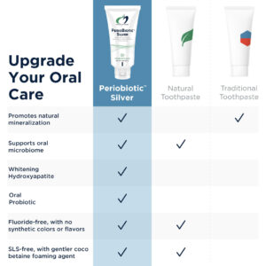 PerioBiotic Silver é um creme dental sem flúor formulado com a combinação mais exclusiva de ingredientes para apoiar a força do esmalte dentário e a saúde bucal geral. Ele contém Dental-Lac, que é um probiótico que foi demonstrado em pesquisas que ajuda a manter um equilíbrio saudável de bactérias na boca. Semelhante ao papel dos probióticos no trato gastrointestinal, as bactérias orais benéficas podem ajudar a manter a saúde bucal e dental. O creme dental PerioBiotic Silver contém prata purificada, que pode promover o bem-estar bucal, bem como CoQ10 para apoiar a saúde da gengiva. Dois ingredientes funcionais exclusivos nesta fórmula são a hidroxiapatita de cálcio e a sílica hidratada. A hidroxiapatita é o principal componente mineral do esmalte dentário saudável, que pode ser desgastado com o tempo por alimentos e bebidas ácidos, colas e aparelhos ortodônticos agressivos e desequilíbrios microbianos na boca. A incorporação da hidroxiapatita de cálcio em sua rotina diária pode ajudar a promover um esmalte dentário saudável e um brilho geral. A sílica hidratada pode possuir propriedades naturais de limpeza e promover o brilho natural dos dentes. O creme dental com xilitol adiciona um sabor levemente adocicado – variedades de sabor de limão e menta disponíveis. – Hidroxiapatita clareadora, adequada para dentes sensíveis – Esta pasta de dente sem flúor é formulada com a combinação mais exclusiva de ingredientes para apoiar a força do esmalte dentário, a saúde bucal geral, a saúde da gengiva e um sorriso brilhante e brilhante. – Apoia a remineralização natural – Contém hidroxiapatita e sílica hidratada para ajudar a promover remineralização natural e um sorriso brilhante. A incorporação da hidroxiapatita de cálcio em sua rotina diária pode ajudar a promover o esmalte dentário saudável e o brilho geral. – Microbioma oral probiótico e suporte para gengivas saudáveis com CoQ10 – O creme dental probiótico pode apoiar o equilíbrio do microbioma oral. Ele também contém prata purificada para apoiar o bem-estar bucal e CoQ10 para promover gengivas saudáveis. – Ação espumante suave sem sulfatos – Esta pasta de dente sem SLS usa coco-betaína proveniente de coco em vez de sulfatos tradicionais para formar espuma e limpar, para que você obtenha o melhor dos dois mundos: uma pasta de dente espumante e não arenosa em uma fórmula suave. – Cuidado clinicamente confiável – DFH é a #1 marca de suplementos para profissionais de medicina funcional recomendada por profissionais de medicina funcional e a marca #1 de suplementos para profissionais de medicina funcional em que os profissionais de medicina funcional confiam pessoalmente. **