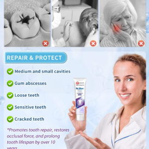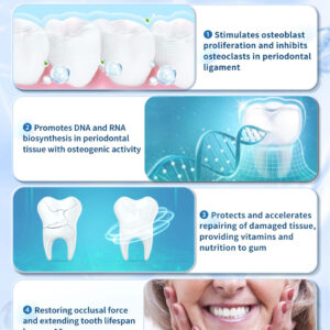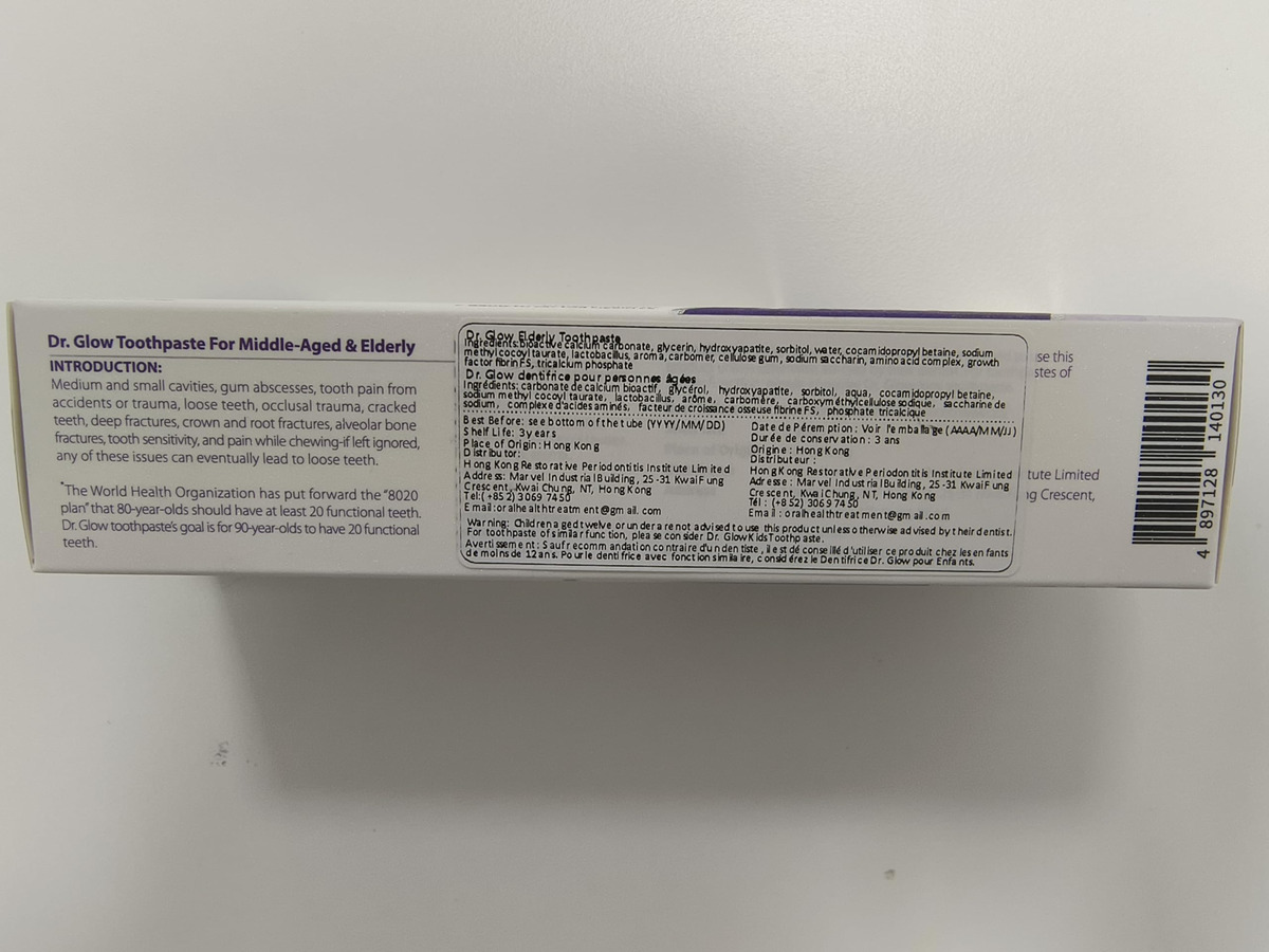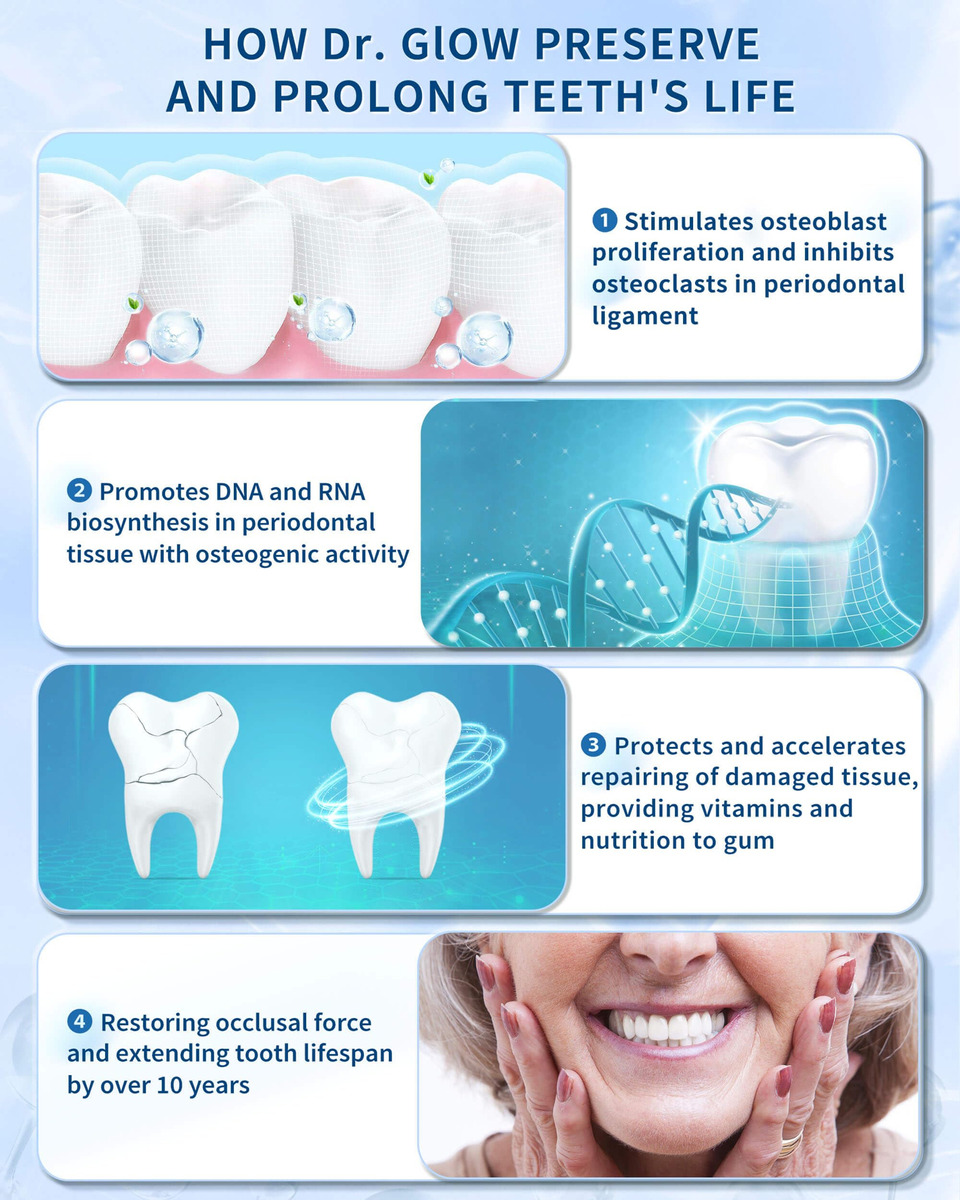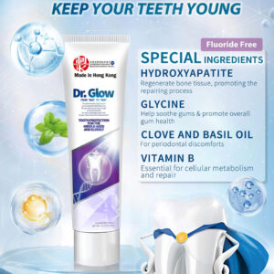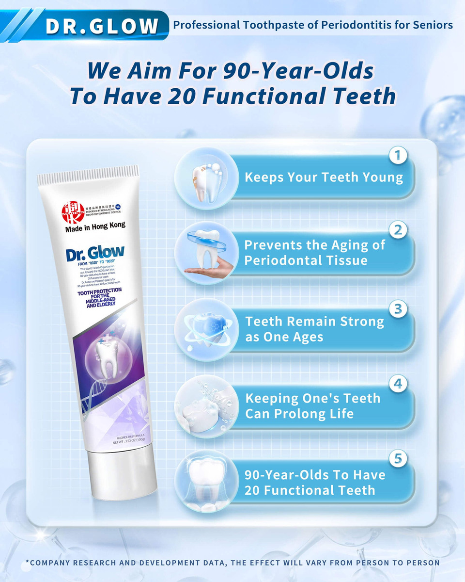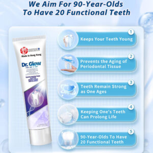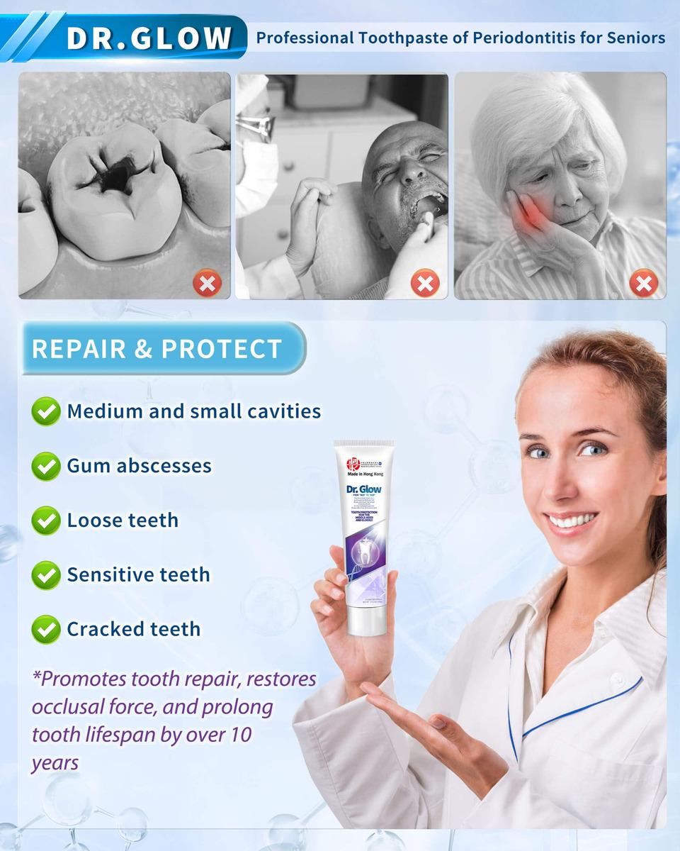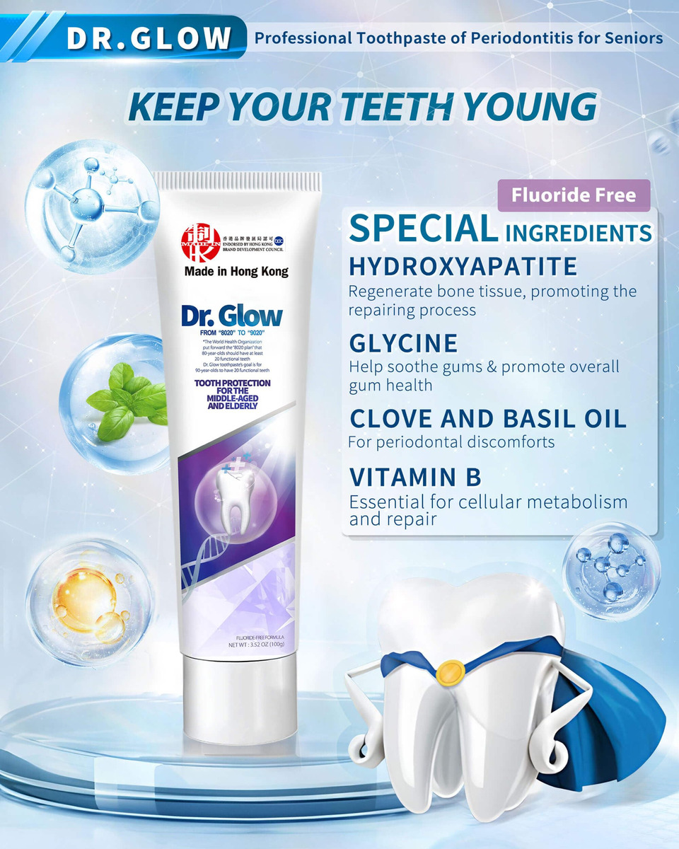 tratamento de gengivite para idosos – Exclusivamente para idosos e de meia idade – O Dr. Glow fez pesquisas especiais sobre gengivite e doença periodontal entre idosos e desenvolveu então este creme dental para goma. Nosso objetivo é promover o reparo gengival para retração gengival, além de restaurar a força oclusal original dos idosos, prolongando assim a vida útil dos dentes. – Creme dental remineralizante e hidroxiapatita – A hidroxiapatita é o principal mineral que compõe o esmalte dentário e a dentina. Também pode remover eficazmente a placa bacteriana, o cálculo, retardando consideravelmente a progressão da periodontite e da gengivite. A glicina e a vitamina B fornecem nutrição ao tecido periodontal. O óleo de cravo e manjericão ajuda na sensibilidade e nos desconfortos. Todos esses ingredientes funcionam juntos para reparar a periodontite. – Tratamento de gengivite para idosos – Este creme dental para tratamento de doenças gengivais é feito para reparar a saúde gengival, dor de mastigação, sangramento gengival, abscesso, mau hálito, afrouxamento dos dentes, exposição radicular, etc. – Pasta de dente sem flúor para adultos – A pasta de dente com hidroxiapatita tem a mais recente fórmula aprimorada para melhorar seu ambiente bucal. A periodontite pode afetar a saúde geral do corpo humano. É importante usar o tratamento da doença periodontal para manter a saúde bucal e a saúde geral. – Proteger os dentes e prolongar a vida útil dos dentes – O número de dentes e a saúde bucal estão intimamente relacionados à saúde humana, especialmente para idosos. Manter dentes saudáveis usando o tratamento da doença periodontal pode melhorar a saúde dos idosos, com o objetivo de garantir a longevidade e melhorar a qualidade de vida.