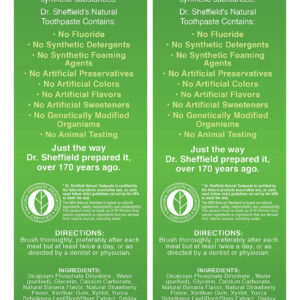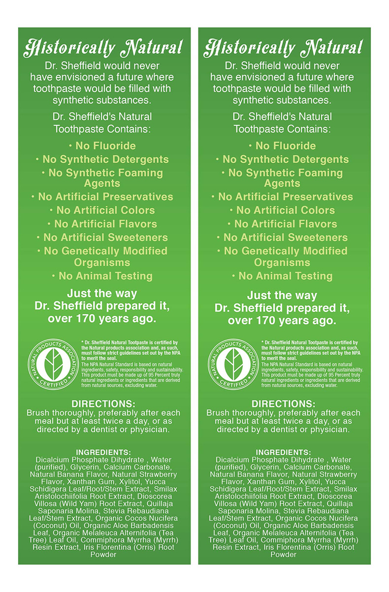 Certificado como natural pela Natural Products Association (NPA) Great Tasting Extra Whitening: ajuda a remover manchas para um sorriso mais branco e brilhante Sem flúor, sem agentes espumantes sintéticos, sem detergentes sintéticos, sem conservantes, cores, sabores e adoçantes artificiais Do inventor da pasta de dente e pasta de dente em um tubo desde 1850 – A PASTA DE DENTE ORIGINAL: Em 1850, o Dr. Sheffield criou uma nova limpeza de dentes produto chamado creme dental, substituindo os pós dentais comuns. Hoje, continuamos seu legado fornecendo a você uma pasta de dente natural certificada e saborosa que você pode desfrutar! – CONHECIDA PELO EXCELENTE SABOR: garantimos que nossa pasta de dente deixe um sabor excelente, evitando quaisquer substâncias ou conservantes nocivos. Receitas testadas pelo tempo com sabor REAL! – STRAWBERRY BANANA: Nosso creme dental Strawberry Banana está repleto de sabores que crianças e adultos adoram. Desfrute desse frescor duradouro. – PASTA DE DENTES NATURAL CERTIFICADA: Nossa pasta de dente é certificada como natural pela Associação de Produtos Naturais (NPA). – SEM FLÚOR OU OUTROS SINTÉTICOS: Sem flúor, sem agentes espumantes sintéticos, sem conservantes artificiais, cores, sabores e adoçantes, sem OGM.