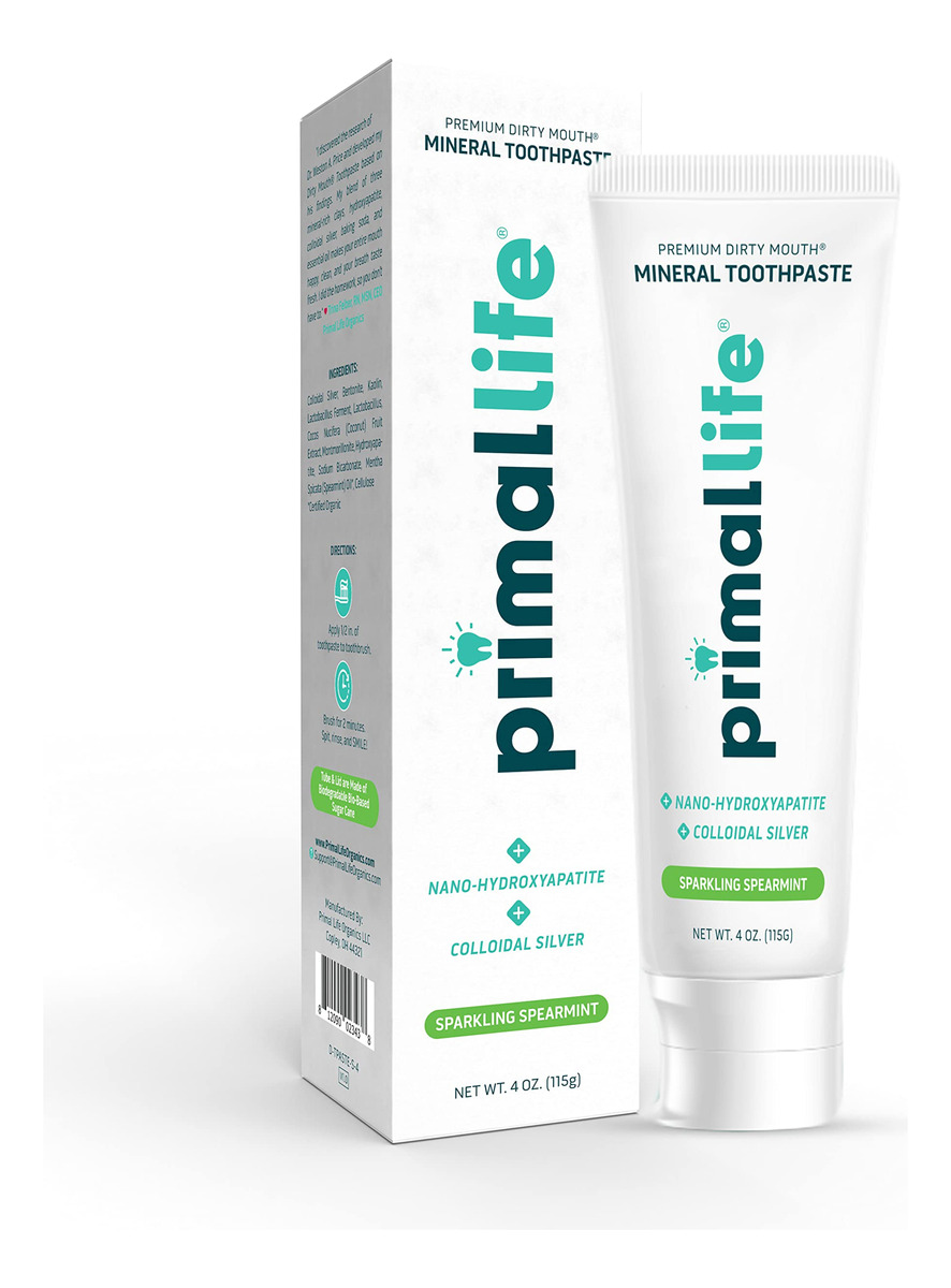 O creme dental mineral Primal Life Organics Premium Dirty Mouth deixa seu sorriso mais brilhante, dentes mais fortes e um hálito mais fresco! Nossa fórmula exclusiva combina prata coloidal, nano-hidroxiapatita para remineralização e os benefícios ricos em minerais da bentonita, caulim e argilas verdes francesas. Infundido com bicarbonato de sódio e aromatizado com óleos essenciais, ele fará com que você deseje escovar. Livre de aditivos, sabores e conservantes artificiais. Diga adeus às cáries, à sensibilidade dentária e às gengivas inflamadas! – SMILE BRIGHTER: Nosso creme dental contém nano-hidroxiapatita para remineralização e os benefícios ricos em minerais da bentonita, caulim e argilas verdes francesas para limpar, branquear e fortalecer os dentes. – REFRESCA A BOCA: deixa a boca revigorada com ingredientes naturais e orgânicos, como prata coloidal, bentonita, extrato de frutas e óleos essenciais orgânicos. Livre de aditivos artificiais, conservantes, agentes espumantes, cores, sabores artificiais, carragenina, triclosan e SLS. – MELHORA A SAÚDE BUCAL GERAL: reduz eficazmente cáries, gengivas inflamadas e sensibilidade dentária. É como fazer uma limpeza profissional toda vez que você escova. – Feito nos EUA: criado nos EUA em nossas instalações para que você possa confiar que está dando o melhor de si para sorrir. – SEGURO PARA USO DIÁRIO: Para obter melhores resultados, escove duas vezes ao dia. Aplique 1/2 polegada de pasta de dente na escova de dentes. Escove por 2 minutos. Cuspa, enxágue e sorria!