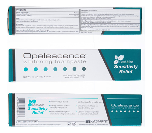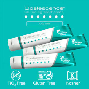 O creme dental branqueador Opalescence foi desenvolvido por um dentista, então você sabe que é diferente de outros cremes dentais. Sua mistura exclusiva de sílica remove ativamente as manchas superficiais. Além disso, é suave o suficiente para uso diário. Combine-o com nossos kits profissionais de clareamento dental para manter o sorriso brilhante e saudável que você deseja. Está disponível nas fórmulas Original ou de Alívio da Sensibilidade, em tubos de 1,0 onça ou 4,7 onças e com um sabor de menta fresca. Ele contém fluoreto de sódio para ajudar a proteger contra cáries e fortalecer o esmalte, e inclui uma mistura exclusiva de sílica que remove ativamente as manchas superficiais para clarear os dentes. A fórmula Sensitivity Relief também apresenta nitrato de potássio de força máxima para ajudar a aliviar a sensibilidade dentária. Além do flúor para fortalecer o esmalte e da sílica para remover manchas superficiais, a fórmula Opalescence Whitening Toothpaste Sensitivity Relief também contém nitrato de potássio de força máxima para ajudar a aliviar a sensibilidade dentária. Esta fórmula é uma excelente opção para quem tem dentes sensíveis e que também procura um creme dental branqueador profissional comprovado e eficaz. É adoçado com xilitol, o que pode reduzir o risco de cárie dentária. Além disso, ambas as fórmulas são veganas e não são usados produtos de origem animal. Eles também são isentos de glúten e certificados como kosher, portanto, se encaixam no estilo de vida e nas crenças de pacientes de diversas origens. Com mais de 30 anos de experiência, mais de 50 prêmios de clareamento dental conquistados e mais de 100 milhões de sorrisos iluminados. O nome Clareamento dental Opalescence é sinônimo de qualidade. Os géis, bandejas, seringas e cremes dentais para clareamento dental Opalescence são fabricados nos EUA a partir de materiais de origem global. – Creme dental branqueador de dentes: creme dental clareador para remoção de manchas e uma mistura exclusiva de sílica – Para dentes sensíveis: creme dental com flúor ajuda a proteger contra cáries e fortalece o esmalte – Branqueamento de dentes sensíveis: contém nitrato de potássio de força máxima para ajudar a aliviar a sensibilidade dentária – Cuidados dentários: glúten grátis; kosher; adoçado com xilitol, que pode reduzir o risco de cárie dentária — Fabricado nos EUA: produtos Opalescence são feitos nos EUA a partir de materiais de origem global
