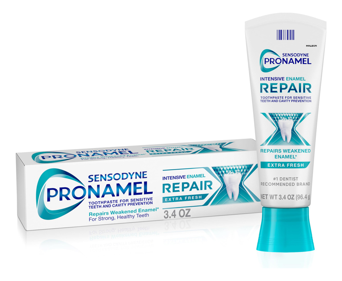 Creme dental de reparo intensivo de esmalte Sensodyne Pronamel para dentes sensíveis, para endurecer e fortalecer o esmalte, extra fresco – 3,4 onças – Um tubo de 3,4 onças de creme dental de reparo intensivo de esmalte Sensodyne Pronamel extra fresco para dentes sensíveis, para endurecer e fortalecer o esmalte – Pasta de dente para reparo do esmalte que inibe a desmineralização, repara microdanos e reconstrói a resistência do esmalte – Proporciona alívio duradouro, este creme dental esmaltado sensível protege você contra os gatilhos da dor – Creme dental esmaltado forte para reparo do esmalte dentário que evita cáries e ácidos erosão causada pela exposição a alimentos e bebidas ácidas – Creme dental sensível com flúor para proteger você contra cáries – Pasta de dente extra fresca que deixa os dentes limpos e refresca o hálito – Escove por dois minutos com essa pasta de dente sensível, duas vezes ao dia