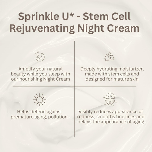 Sprinkle U – Stem Cell – Creme Noturno | Fórmula concentrada antienvelhecimento e antirrugas que combate os sinais de envelhecimento nas mãos e no rosto. Utilizando células-tronco vegetais, retinol, colágeno, niacinamida, vitamina C e ácido hialurônico para promover uma pele mais suave, firme e com aparência mais jovem.