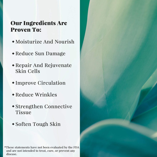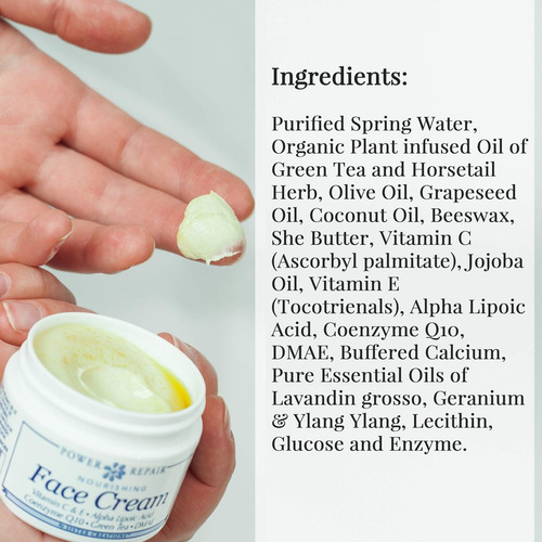 Ingredientes: Contém: água mineral purificada, óleo orgânico de chá verde e rabo de cavalo, azeite de oliva e uva óleo de semente, óleo de coco, manteiga de karité, éster de vitamina C, óleo de jojoba, tocotrienóis (vitamina E), ácido alfa lipóico, coenzima Q-10, DMAE, cálcio tamponado, óleos essenciais puros de lavadina grosso, gerânio, e ylang ylang, lecitina, glicose e enzima.