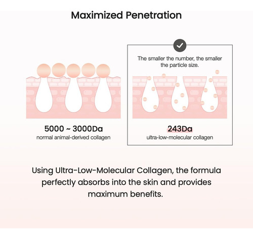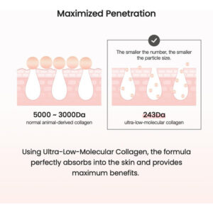 Contém colágeno com um teor molecular ideal peso para uma absorção eficaz, garantindo resultados visíveis e duradouros. Sua fórmula avançada é profunda nutre, promovendo uma pele saudável e rejuvenescida com uma aparência mais jovem e radiante.