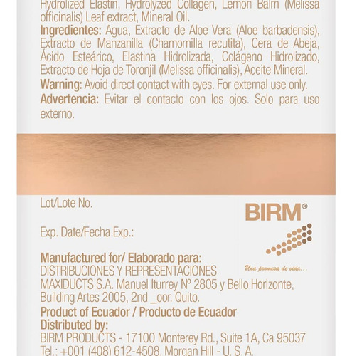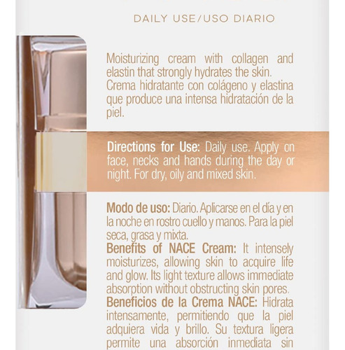 Ingredientes: água, extrato de aloe vera (Aloe barbadensis), extrato de camomila (Chamomilla recutita), Cera de abelha, ácido esteárico, elastina hidrolisada, colágeno hidrolisado, extrato de folha de erva-cidreira (Melissa officinalis), óleo mineral Público-alvo Palavras-chave: hidratante facial, creme anti-rugas, creme de colágeno, creme de elastina, creme antioxidante, creme rejuvenescedor de pele, hidratante não oleoso, creme para pele sensível, creme para homens e mulheres, creme natural para pele, creme de extrato vegetal, creme para linhas finas, hidratante facial, creme para cuidados faciais, creme base de maquiagem, creme diurno e noturno, creme para pele seca, creme para pele madura