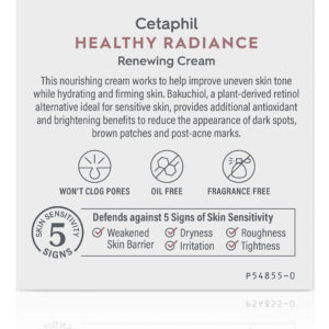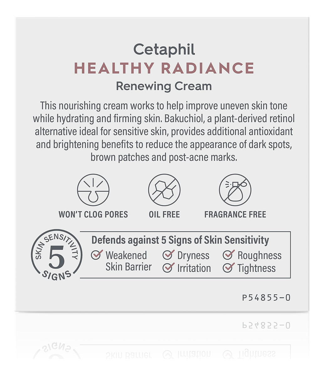 Creme facial da Cetaphil, creme renovador de brilho saudável, reduz visivelmente a aparência de manchas escuras, loção iluminadora, projetada para peles sensíveis, hipoalergênica, sem fragrância, 1,7 onças — CREME RENOVADOR DE BRILHO SAUDÁVEL CETAPHIL: a textura leve de suflê hidrata instantaneamente à medida que derrete na pele, aumentando a resiliência da pele e diminuindo a aparência de manchas escuras – Complexo GentleBright: Powered em 2% de niacinamida (vitamina B3) e antioxidantes nutritivos para reduzir a aparência de manchas escuras, manchas marrons, manchas da idade, hiperpigmentação e marcas pós-acne até tom de pele uniforme para uma tez mais brilhante e radiante – ALTERNATIVA SUAVE AO RETINOL BAKUCHIOL: o bakuchiol derivado de plantas reduz a aparência de hiperpigmentação e manchas escuras, ideal para peles sensíveis sem irritação – HIPOALERGÊNICO, NÃO OBSTRUI OS POROS: este hidratante facial sem fragrância e sem óleo é suave, mas eficaz em peles sensíveis. Ótimo para uso diurno ou noturno. — PROTEGE CONTRA 5 SINAIS DE SENSIBILIDADE DA PELE: ressecamento, irritação, aspereza, rigidez, barreira cutânea enfraquecida — Artigos de higiene pessoal para viagens: este produto tem menos de 3,4 fl oz, facilitando o transporte em suas próximas férias ou viagem