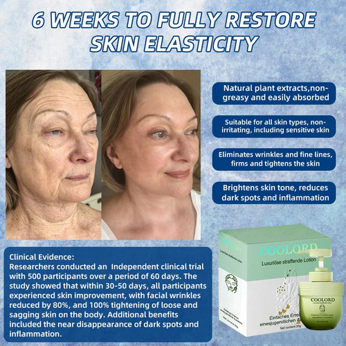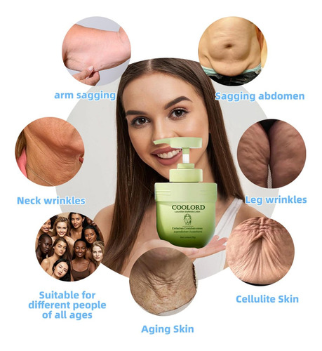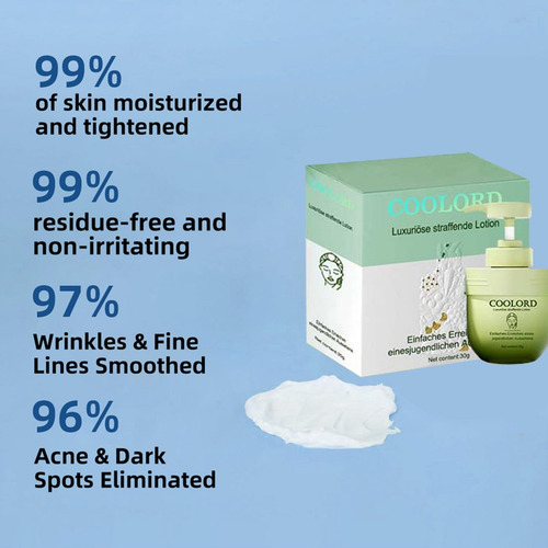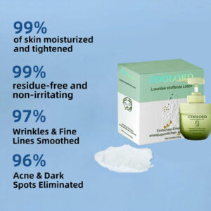 Creme firmador de colágeno Coolord Luxury, um hidratante diário sem fragrância para rosto e corpo que fornece uma dose intensa de hidratação, ajudando a preencher a aparência de linhas e rugas e restaurar a umidade para uma pele mais macia e suave. Formulada com colágeno e elastina, esta loção firmadora exclusiva tonifica e firma visivelmente a pele, mantendo uma aparência jovem e firme. Melhora a resiliência da pele desde a primeira aplicação, nutrindo-a durante a noite; após uma semana de uso, a pele fica mais macia e, em quatro semanas, as rugas parecem mais volumosas. Sua textura leve e não oleosa hidrata todos os tipos de pele, incluindo peles sensíveis, sendo rapidamente absorvida sem deixar uma sensação pegajosa, para uma pele mais macia, nutrida e com aparência mais jovem.