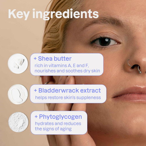 Público-alvo Palavras-chave: creme de dia, pele sensível, manteiga de karité, ingredientes naturais, fórmula suave, hidratante facial, calmante para pele seca, extrato de algas vesiculares, fitoglicogênio, pele hidratada, fragrância fórmula sem gordura, vegana, sem crueldade, sem plástico, com certificação EWG, cuidado facial, creme vegano, creme biodegradável, cuidados com a pele, creme nutritivo, produto ecológico, creme para pele sensível, hidratante