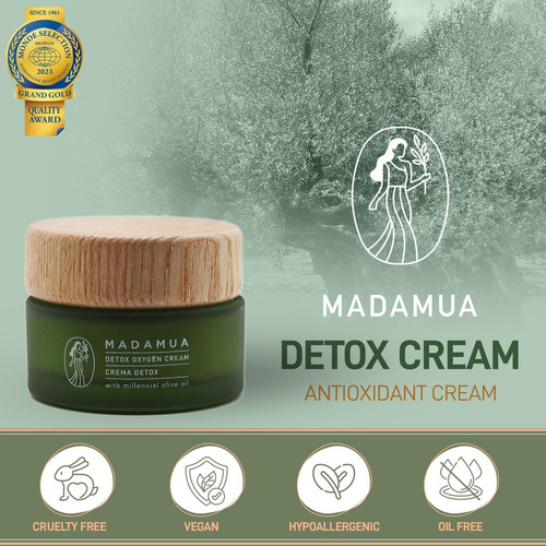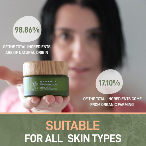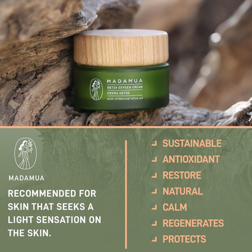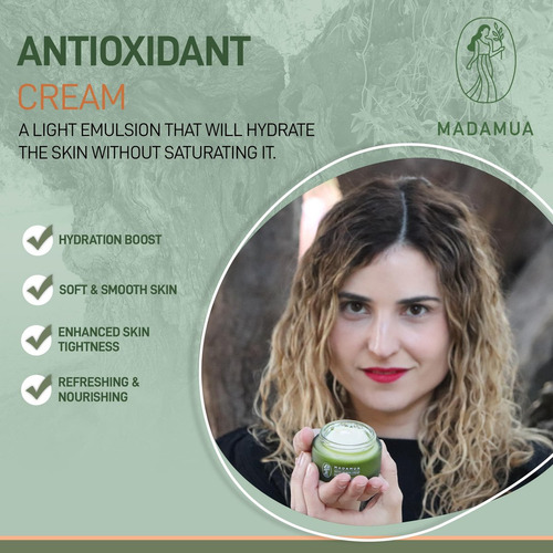 Mantenha sua pele jovem e saudável com este hidratante facial para mulheres, certificado COSMOS Natural pela Ecocert. Na MADAMUA, acreditamos que a melhor maneira de obter uma pele jovem é mantê-la nutrida e hidratada, obtendo um brilho e suavidade que refletem a juventude. Adicione facilmente este creme antioxidante à sua rotina diária: basta massagear até que seja absorvido após a limpeza para proteger sua pele do estresse ambiental, poluição e radicais livres sem a necessidade de equipamento especial. Formulado com 98,86% de ingredientes naturais e 17,10% orgânicos, sua antiga base de azeite de oliva, junto com extratos de chá verde, ginkgo biloba e aloe vera, nutre, esclarece e hidrata profundamente. Os óleos de amêndoa doce e de semente de uva oferecem proteção antioxidante, enquanto o esqualeno e a vitamina E aumentam a regeneração e elasticidade da pele.