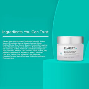 Revitalize sua pele aproveitando o poder restaurador da vitamina C com nosso Creme Facial Hidratante Antioxidante C-Results. Este produto é a etapa final de nossa coleção de cuidados faciais com vitamina C em 4 etapas, ideal para todos os tipos de pele, desde propensa a acne e sensível até seca e madura. Ele deixa seu rosto hidratado, radiante e com aparência mais brilhante. Seus principais ingredientes incluem vitamina C estabilizada, que promove a saúde do colágeno sem causar irritação; antioxidantes potentes que reduzem o inchaço e protegem contra os radicais livres; hialuronato de sódio, derivado do ácido hialurônico, para manter a pele hidratada e flexível; e niacinamida, que reduz a vermelhidão, a oxidação do colágeno e a hiperpigmentação. Use-o após o limpador, sérum e creme para os olhos C-Results para um brilho saudável e mais luminoso, e não se esqueça de aplicar protetor solar pela manhã. Os produtos ClarityRx não contêm parabenos e são fabricados nos Brasil sem retinóis agressivos, adição de fragrâncias sintéticas, peróxidos de benzoíla ou outros produtos químicos nocivos.