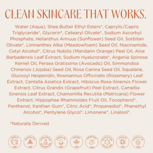 Ingredientes do pacote: água (água), ésteres etílicos de manteiga de karité*, tampa Triglicerídeos cápricos*, glicerina*, olivato cetearílico*, fosfato de ascorbil sódico*, óleo de semente de Helianthus Annuus (girassol), olivato de sorbitano*, óleo de semente de Limnanthes Alba (Meadowfoam), niacinamida, álcool cetílico*, citrinos Óleo de casca de Nobilis (tangerina), extrato de folha de Aloe Barbadensis, hialuronato de sódio*, óleo de semente de Argania Spinosa, óleo de persea gratissima (abacate), óleo de semente de Simmondsia Chinensis (jojoba), óleo de semente de Rosa Canina, esqualano, glucosil hesperidina, folha de Rosmarinus officinalis (alecrim) Extrato, extrato de Centella Asiatica, extrato de flor de Hibiscus Rosa-Sinensis, extrato de casca de Citrus Grandis (toranja), extrato de folha de Camellia Sinensis, extrato de flor de Chamomilla Recutita (Matricaria), óleo de fruta Hippophae Rhamnoides, tocoferol*, pantenol, goma xantana*, ácido cítrico*, Propanodiol*, álcool fenetílico*, pentilenoglicol*, limoneno*, linalol*. *Derivado naturalmente.