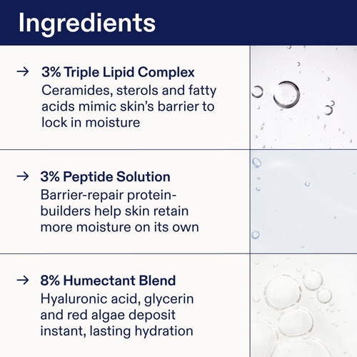 Sua fórmula com complexo lipídico triplo e peptídeos imita a barreira natural da pele para manter a hidratação ao longo do dia.