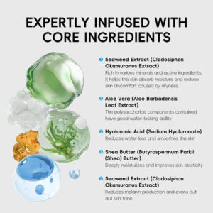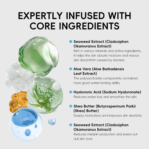Ingredientes principais: MANTEIGA PARKII (SHEA) DE BUTYROSPERMUM, EXTRATO DE CLADOSIPHON OKAMURANUS, EXTRATO DE GLABRA GLYCYRRHIZA (LICORICE), HIALURONATO DE SÓDIO, EXTRATO DE FOLHA DE BARBADENSIS DE ALOE