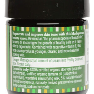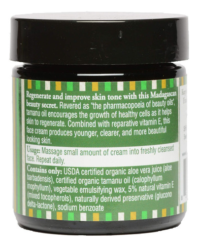 Ingredientes: suco orgânico de aloe vera certificado pelo USDA (aloe barbadensis), óleo de tamanu orgânico certificado (calofise) llum inophyllum), cera emulsificante vegetal, 5% de vitamina E natural (tocoferóis mistos), conservante de origem natural (glucono delta-lactona), benzoato de sódio Público-alvo Palavras-chave: óleo de tamanu, óleo natural, Óleo de tamanu de Madagascar, cuidados com a pele, purificador da pele, clareador da pele, combate a acne, antioxidantes naturais, anti-rugas, hidratante facial, óleo orgânico, vitamina E para pele, regeneração celular, tratamento para pele seca, tratamento para cortes, óleo cicatricial, propriedades antienvelhecimento, antibacterianas, cuidado facial natural, hidratação profunda, aloe vera orgânico, creme