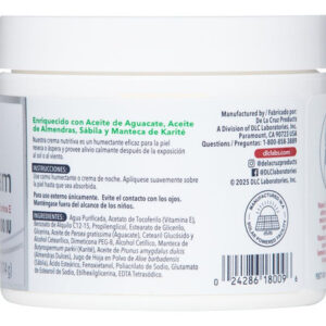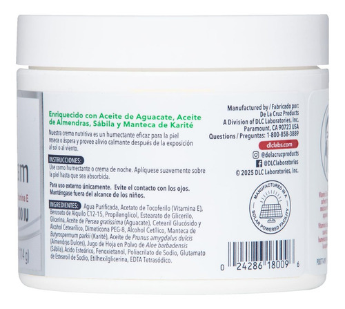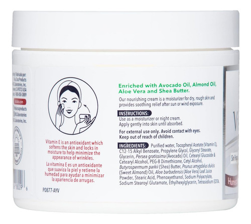 Ingredientes: água purificada, acetato de tocoferil (vitamina E), alquilbenzol C12-15, propilenoglicol, estearato de glicerila, glicerina, óleo de Persea gratissima (abacate), glicosídeo cetearílico e álcool cetearílico, dimeticona PEG-8, álcool cetílico, manteiga de butyrospermum parkii (karité), Prunus amygdalus dulcis (doce