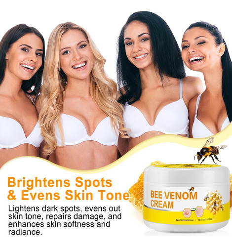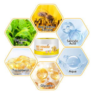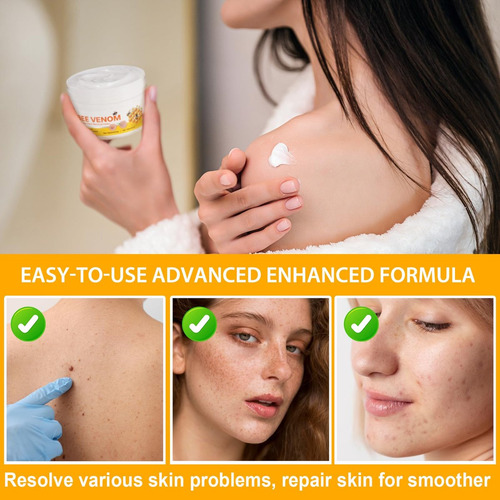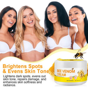 – Poderoso reparador da pele: enriquecido com veneno de abelha, este creme estimula a produção de colágeno e acelera o reparo da pele, reduzindo a aparência de cicatrizes, manchas e manchas.