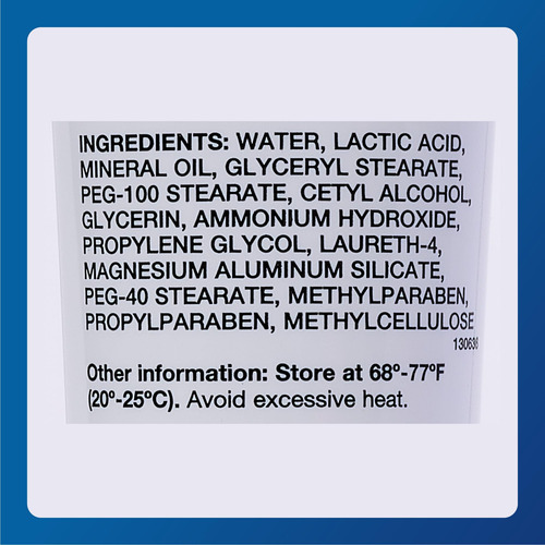 • INGREDIENTES ATIVOS: Este creme é especialmente formulado com 12% de ácido lático e neutralizado com hidróxido de amônio para um pH de 4,5 a 5,5. O ácido láctico é um alfa-hidroxiácido e um umectante natural para a pele.