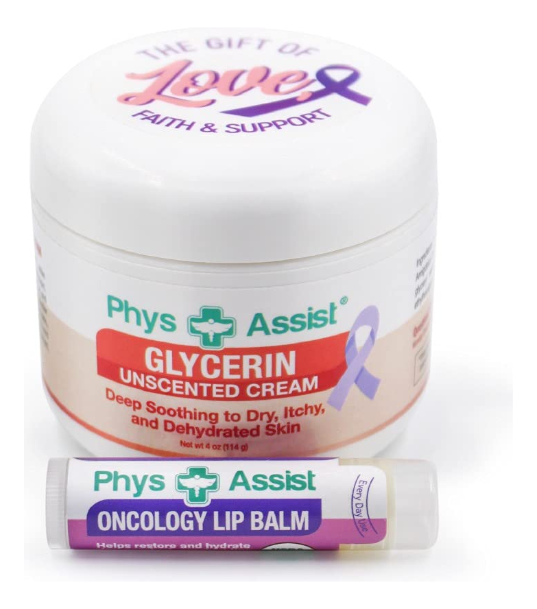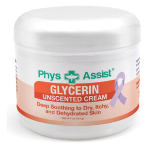 O Creme de Glicerina Sem Perfume PhysAssist ajuda a proteger a pele do meio ambiente, fortalecendo a delicada barreira de hidratação da pele. A glicerina pode extrair umidade do ar ao nosso redor e ajudar a manter essa umidade na pele. Isso o torna um hidratante superior para refrescar e acalmar a pele seca, ressecada, com coceira e irritada. Este creme de glicerina, enriquecido com óleos preciosos de amêndoa doce e jojoba, além de arnica e vitamina E, pode ajudar a reparar a pele estressada, rachada e danificada. Nosso creme contém ingredientes calmantes, calmantes e hidratantes que ajudam a reduzir o ressecamento e hidratar a pele durante a quimioterapia e radioterapia. Recomendamos usar o creme sem perfume de glicerina enquanto a pele ainda estiver úmida do banho para melhor absorção. Reaplique o creme à noite. Pode ser usado do rosto aos pés. Aplique 2 a 3 vezes ao dia ou conforme necessário. Não aplique o creme em feridas abertas. Vem com o protetor labial oncológico – ingredientes naturais; sem fragrância, sem parabenos, cor, petróleo ou ingredientes de origem animal. Ajuda a hidratar e proteger a pele irritada e com coceira – Glicerina: é um hidratante superior que refresca e acalma a pele seca, escamosa, ressecada e irritada. A glicerina pode extrair umidade do ar ao nosso redor e ajudar a manter essa umidade na pele – Outros ingredientes: jojoba, amêndoa doce, arnica. São óleos preciosos que podem ajudar com a irritação e inflamação da pele. Pode ajudar na reparação da pele rachada, irritada e danificada. – O creme de glicerina sem perfume pode ser usado duas vezes ao dia ou conforme necessário. Aplique suavemente na pele sem esfregar ou pressionar. – Facilmente absorvido, sem fragrância, ideal para pessoas com sensibilidade à fragrância e pode ser usado do rosto aos pés. Aplique o creme hidratante PhysAssist Glycerin Unscented Oncology enquanto sua pele ainda está úmida. Também hidrate as mãos após cada lavagem.