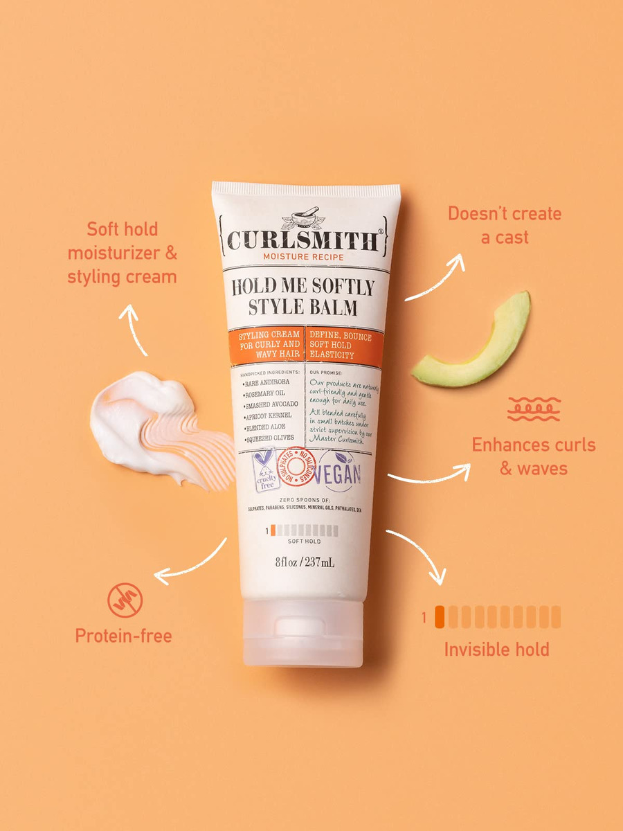 CURLSMITH — Bálsamo Hold Me Softly Style — Creme modelador vegano de fixação suave para cabelos ondulados e encaracolados, aparência natural (8fl oz) — SUAVE NATURAL HOLD — The Style Balm é um creme modelador de fixação suave que realça os cachos e as ondas, proporcionando uma aparência natural e romântica. – COMO A MÁGICA ACONTECE – Por causa de sua fixação macia, o bálsamo não cria um tom ao redor do cabelo, mantendo-o macio durante todo o processo de secagem. Por si só, criará ondas suaves e naturais. Se você está procurando por mais definição, combine-o com um dos géis modeladores Curlsmith para obter o melhor dos dois mundos! – O QUE NOS TORNA DIFERENTES – Inspirado por gerações de remédios caseiros para o cabelo, o Curlsmith combina alimentos frescos que amam os cachos com itens básicos do armário de cozinha e ingredientes naturais raros para criar produtos premium que realmente funcionam. Ingredientes saudáveis, resultados profissionais, sem concessões. – SEM DESAGRADÁVEIS – Todos os nossos produtos têm zero colheres de sulfatos, silicones, óleos minerais e ftalatos. Além disso, eles são cacheados para meninas, são 100% veganos e livres de crueldade. – CURL JOURNEY – Curlsmith acredita que os cachos não precisam ser complicados, e é por isso que temos a missão de eliminar as suposições. Estamos aqui para ajudá-lo em sua jornada de curvas, independentemente de você ter as ondas mais soltas até as bobinas mais estreitas ou qualquer coisa intermediária.