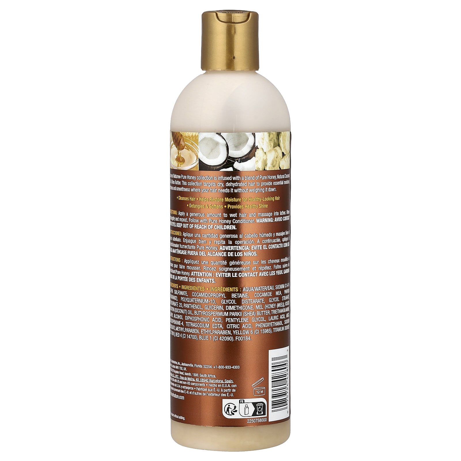 Água/aqua/eau, sodium C14-16 olefin sulfonate, cocoamidopropil betaína, cocamida mea, perfume (fragrância), Poliquatérnio-10, diestearato de etilenoglicol, monoestearato de etilenoglicol, polissorbato 20, pantenol, Glicerina, dimeticona, mel (mel (miel)), óleo de Cocos nucifera (coco), Manteiga de Butyrospermum ParkII (Karité), trietanolamina, álcool laurileterácido e ácido difosfônico, pentileno glicol, ácido láurico, mica, benzofenona-4, EDTA tetrassódico, ácido cítrico, fenoxietanol, benzoato de sódio, metilparabeno, etilparabeno, amarelo crepúsculo (CI 15985), Dióxido de titânio (CI 77891), vermelho 4 (CI 14700), azul brilhante (CI 42090).
