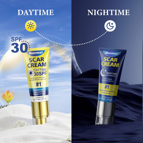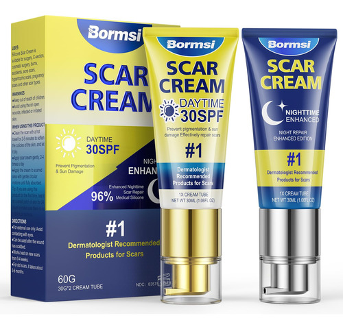 O creme para cicatrizes BORMSI, protetor solar SPF 30 e gel intensivo para cicatrizes noturnas em silicone PM reduz a aparência de cicatrizes cirúrgicas, estrias, quelóides, 2 tubos, 1,76 onças/tubo
