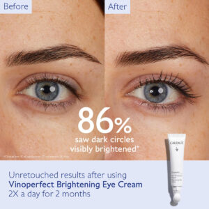 Um creme para os olhos visivelmente iluminador que, clinicamente, reduz a aparência de todos os tipos de olheiras com o poder da viniferina, cafeína e niacinamida. – CREME ILUMINADOR DE CÍRCULOS ESCUROS VINOPERFECT: Um creme para os olhos visivelmente iluminador e sem fragrância que reduz clinicamente a aparência de todos os tipos de olheiras com o poder da viniferina, cafeína e niacinamida. – RESULTADOS CLÍNICOS: Em um estudo clínico com 22 voluntários, 86% viram as olheiras visivelmente clareadas após 56 dias. – INGREDIENTES: A viniferina é 62 vezes mais eficaz do que a vitamina C em clareando olheiras; a niacinamida uniformiza visivelmente a textura sob os olhos e hidrata; a cafeína desperta e ilumina visivelmente a área dos olhos. – RESULTADOS CLÍNICOS PATENTEADOS DA VINE SAP VINIFERINE: Em um teste in vitro sobre a ação inibidora da Viniferina na tirosinase, os resultados mostraram que ela é 62 vezes mais eficaz do que a vitamina C no clareamento. – USO: Aplique o Creme Iluminador Vinoperfect de manhã e à noite até o contorno dos olhos usando sua ponta de cerâmica refrescante.