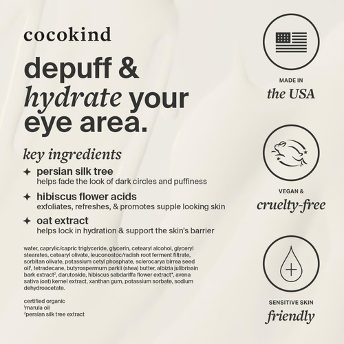 Creme revitalizante para os olhos da Cocokind, purifica e reduz linhas finas e rugas, creme para uma área dos olhos mais firme e brilhante, hidratante com uma ponta aplicadora de metal fresco, 0,5 ml de onça — ILUMINE E DESPUFE: o extrato da planta Persian SilkTree foi desenvolvido para ajudar a atenuar a aparência de olheiras e inchaços. Nossa ponta aplicadora de metal higiênico ajudará a acalmar e refrescar a pele sob os olhos, suavizando a aparência dos pés de galinha e das rugas – HYDRATE: retenha a hidratação e apoie a barreira de umidade da pele. A pele ao redor dos olhos perde umidade 50% mais rápido do que o resto da pele. Feito com extrato de aveia para ajudar a reduzir a aparência de pele seca e olheiras – NÃO AGRIDE A PELE SENSÍVEL: Nosso creme hidratante para os olhos é livre de crueldade, fragrância, vegano e sem óleos essenciais – COCOKIND: produtos para cuidados com a pele que são ecologicamente corretos sem comprometer a formulação. Nossos produtos têm como objetivo cumprir suavemente a função que prometem, bem como hidratar e apoiar a barreira da pele, o que acreditamos que leva a uma pele brilhante e feliz. DURADOURO: A maioria dos nossos produtos tem uma vida útil de cerca de 12 meses após a abertura. Na parte inferior de cada caixa de produto, listamos um símbolo POA (período após a abertura). Deve parecer um pequeno frasco aberto com um número e a letra M (meses). Isso ajudará você a determinar por quanto tempo cada produto é válido após a abertura.