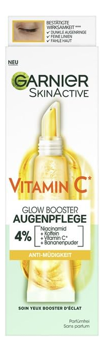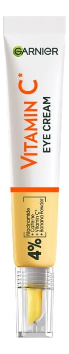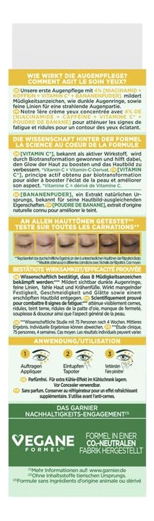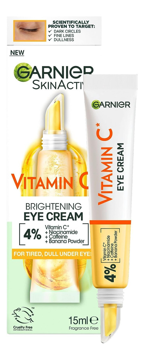 Creme para os olhos Garnier, com 4% de vitamina C, tratamento clareador para olheiras, previne bolsas e inchaço sob os olhos, vitamina C*, 15 ml a 4% de VITAMINA C, NIACINAMIDA, CAFEÍNA, BANANA: o creme clareador de olhos Garnier com vitamina C é nosso primeiro creme para os olhos concentrado com 4% de vitamina C, niacinamida, cafeína e banana em pó. – EFICÁCIA COMPROVADA: testado em todos os tons de pele, nosso creme para os olhos está cientificamente comprovado que reduz a aparência de 8 sinais de fadiga**, olheiras, linhas finas sob os olhos, embotamento, pés de galinha, falta de firmeza, suavidade, maciez e em geral aparência da pele. Em 1 semana, obtenha olhos mais brilhantes e bem descansados. – ROTINA COMPLETA DE VITAMINA C: complete seu regime de clareamento com a água micelar iluminadora com vitamina C Garnier, o sérum de niacinamida e ácido salicílico de 3,5% de vitamina C e o hidratante de vitamina C. Continue com a máscara em folha de vitamina C para turbinar e iluminar sua pele em apenas 15 minutos! – APROVADO PELA LEAPING BUNNY: Todos os produtos Garnier em todo o mundo são oficialmente aprovados pela Cruelty Free International no âmbito do Programa Leaping Bunny, a organização líder que trabalha para acabar com os testes em animais em todo o mundo. Nosso creme para os olhos tem uma fórmula vegana, sem ingredientes ou subprodutos de origem animal. Tanto a caixa quanto o tubo podem ser reciclados.