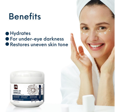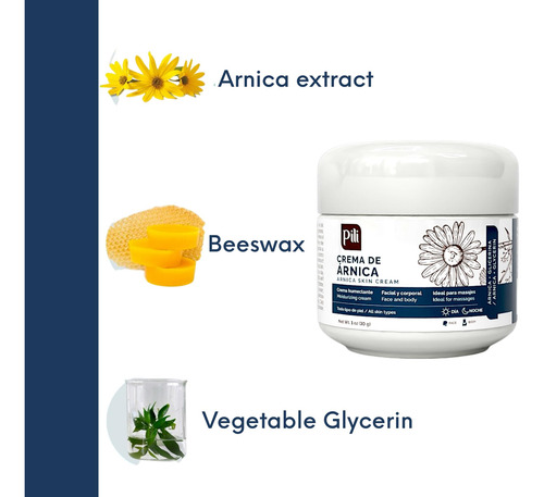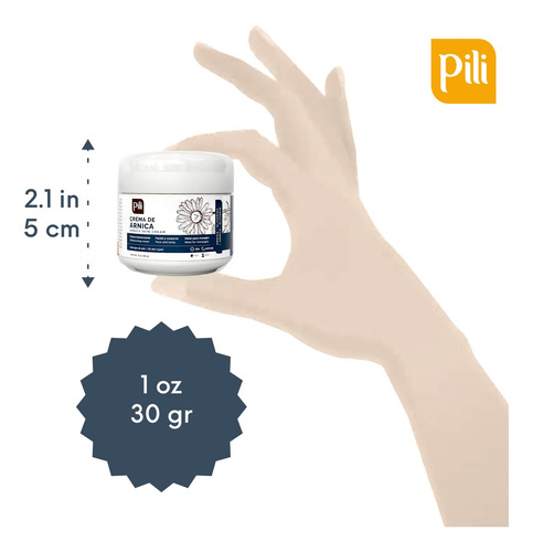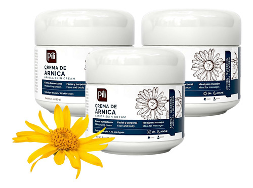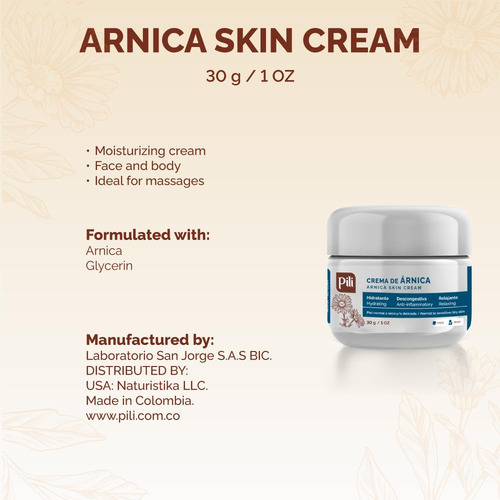 Melhore seus cuidados com a pele com o creme Pili Arnica, um pacote de 3 onças cada. Este hidratante rico e nutritivo acalma e hidrata, deixando sua pele suave. Este creme de arnica oferece o máximo de benefícios, aliviando os desconfortos corporais e promovendo uma experiência relaxante. Feito com arnica natural, acalma, suaviza e reforça naturalmente a beleza. Perfeito para pele seca severa ou delicada. Sem perfume, não oleoso e livre de crueldade, é um creme facial versátil e ideal para mãos e pés. Desenvolvida por profissionais experientes, nossa fórmula penetra na pele, repara e rejuvenesce. Aproveite os benefícios de uma fórmula de ação dupla, de rápida absorção e sem fragrância. Diga adeus à secura e olá à suavidade palpável! Este produto é fabricado por pessoas apaixonadas com mais de 60 anos de experiência nas indústrias de varejo de farmácia e fabricação de cosméticos. Estamos comprometidos em provar a você apenas os melhores produtos que a natureza tem a oferecer. Aproveite este novo pacote de 3 de 1 onça cada. Instruções: Massageie na pele seca até 5 vezes ao dia. Fabricado por: F.D. San Jorge Ltda. Feito na Colômbia. Distribuído nos Brasil pela Naturistika LLC. https://pilinatural.com/ Ingredientes: água, parafina líquida, ácido esteárico, glicerina, extrato de flor de arnica montana (arnica), octildodecanol, cera de abelha, cetareth-20, álcool cetílico, trietanolamina, propilparabeno sódico, metilparabeno sódico, edta dissódico. – Profundo Hidratação: Pili Arnica Cream é um hidratante rico e nutritivo que hidrata e suaviza a pele com eficácia, deixando-a macia e hidratada. Este creme de arnica oferece o máximo de benefícios, proporcionando alívio aos desconfortos corporais e promovendo uma experiência relaxante. – Propriedades calmantes naturais: formulado com extrato de arnica, este creme naturalmente acalma e suaviza a pele seca e áspera, proporcionando alívio à pele danificada e desidratada. O creme de arnica Pili vai além da mera hidratação, oferecendo alívio genuíno aos desconfortos corporais com um toque calmante. – Uso versátil: este creme de arnica é suave o suficiente para ser usado como creme facial, atendendo às necessidades específicas da pele delicada do rosto. Também é hidratante o suficiente para tratar o ressecamento persistente das mãos e dos pés. – Adequado para animais e sem cor: o creme natural de arnica Pili é livre de crueldade e não contém adição de cores. Estamos comprometidos em produzir um produto que não seja testado em animais, garantindo cuidados com a pele éticos e responsáveis. – Artesanato especializado: fabricado por pessoas apaixonadas com mais de 60 anos de experiência nas indústrias de varejo de farmácia e fabricação de cosméticos, o Pili Arnica Cream é resultado da dedicação em fornecer a você o melhor que a natureza tem a oferecer. Aproveite os benefícios deste creme nutritivo em um pacote conveniente de 3 onças de 1 onça cada.