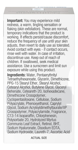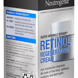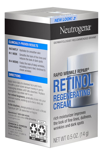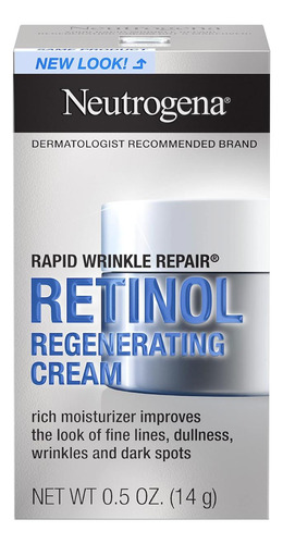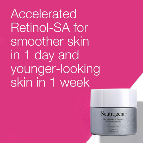 Revele uma pele visivelmente mais jovem em apenas uma semana com Neutrogena Rapid Wrinkle Repair Retinol Anti-Aging Regenerating Face Cream. Este creme hidratante antirrugas com ácido hialurônico e retinol contém uma combinação única de ingredientes que ajudam a regenerar, hidratar e suavizar a pele. Fórmula antienvelhecimento com retinol testado por dermatologistas, um ingrediente poderoso que combate linhas finas, opacidade, rugas e manchas escuras. Este creme antirrugas de retinol também contém ácido hialurônico, que adiciona umidade para ajudar a hidratar e rejuvenescer a aparência da pele. O Creme de Retinol Neutrogena Rapid Wrinkle Repair é adequado para uso diário e é uma excelente parte de sua rotina de cuidados com a pele em casa. Além disso, é livre de parabenos, óleo mineral e corantes e vem da marca de retinol mais utilizada pelos dermatologistas.