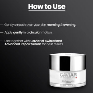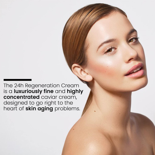 Creme de regeneração 24H da mais luxuosa coleção de cuidados com a pele DNA do Caviar da Suíça com ingredientes de alta tecnologia de ponta, enzimas reparadoras de DNA e o precioso extrato de caviar criam um efeito anti-envelhecimento único que é simplesmente incomparável. Agindo em profundidade a nível celular, melhora drasticamente a elasticidade e a textura, repara os danos causados ??pelo sol e adiciona imediatamente um brilho luminescente. Formulado exclusivamente na montanhosa Swiss Rivera. A QUALIDADE É LEMBRADA MUITO DEPOIS DE O PREÇO SER ESQUECIDO.