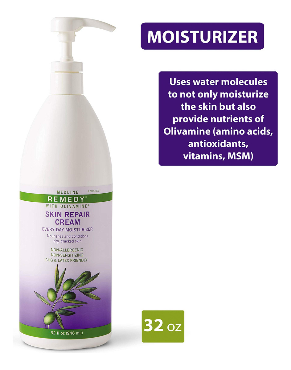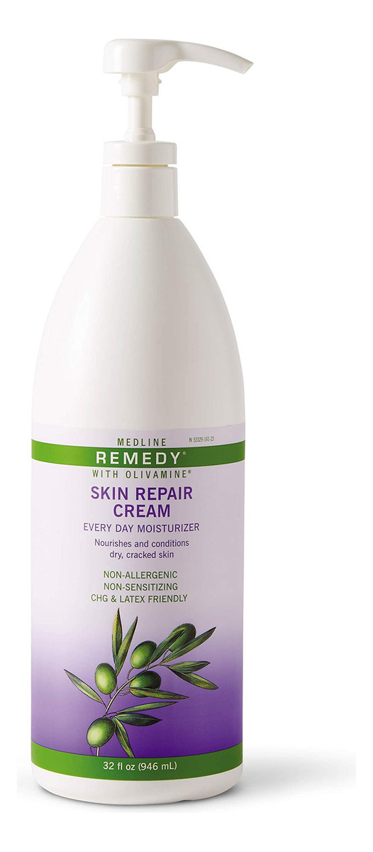 Creme reparador de pele Medline Remedy com olivamina, frasco de 32 onças, levemente perfumado, para pele seca e rachada – O creme reparador de pele Remedy Olivamine ajuda a proteger e aliviar os danos relacionados à lavagem frequente das mãos, como ressecamento, rachaduras, inflamações, vermelhidão e coceira na pele – Mistura de nutrientes direcionada às células da pele, bem como dimetazona para ajudar a prevenir o e-TEWL – Testado para não sensibilizar, não alergênico — Não interfere com o CHG, não interfere nem degrada o látex — Nutre a pele com misturas exclusivas de óleos naturais e emolientes conhecidos como Olivamina