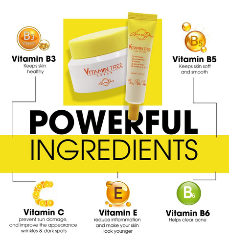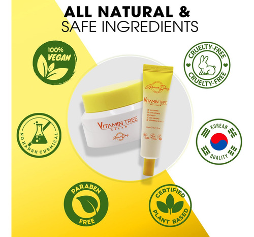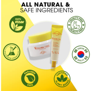 Creme Vitamin Tree 100% vegano certificado. Contém vitamina C, provitamina B5, vitamina E e vitamina B3. Eficaz contra acne, manchas escuras e danos causados pelo sol. Creme antienvelhecimento e anti-rugas para dia e noite com ingredientes naturais. 50 g Fabricado na Coreia (creme facial), o