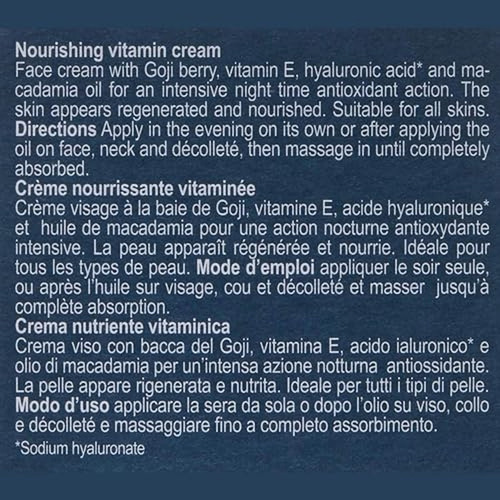 Palavras-chave do público-alvo: creme facial nutritivo, creme facial vitamínico, tratamento noturno, textura rica, goji orgânico certificado, extrato de tomate hidrolisado, pele desidratada, pele estressada, pele empobrecida, para todos os tipos de pele, hidratante facial, cuidados faciais, cremes noturnos, cuidados pessoais, beleza natural, antioxidantes da pele, rejuvenescimento facial, creme nutritivo, creme antioxidante, cuidados com a pele