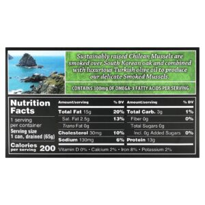 Mexilhões chilenos criados de forma sustentável são defumados sobre o carvalho sul-coreano e combinados com o luxuoso óleo de oliva turco para produzir nossos delicados mexilhões defumados.