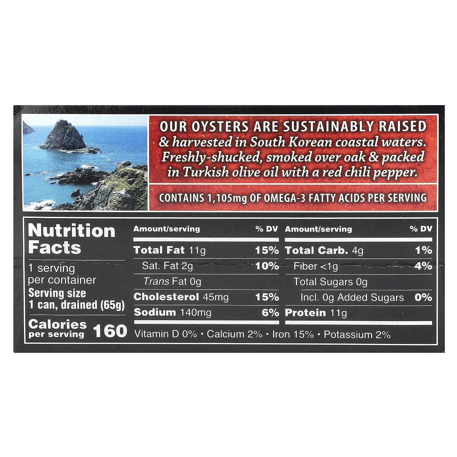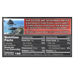 Nossas Ostras São Criadas de Forma Sustentável e colhidas em águas costeiras da Coreia do Sul. Descascadas recentemente, defumadas sobre carvalho e embaladas em óleo de oliva turco com pimenta malagueta vermelha.