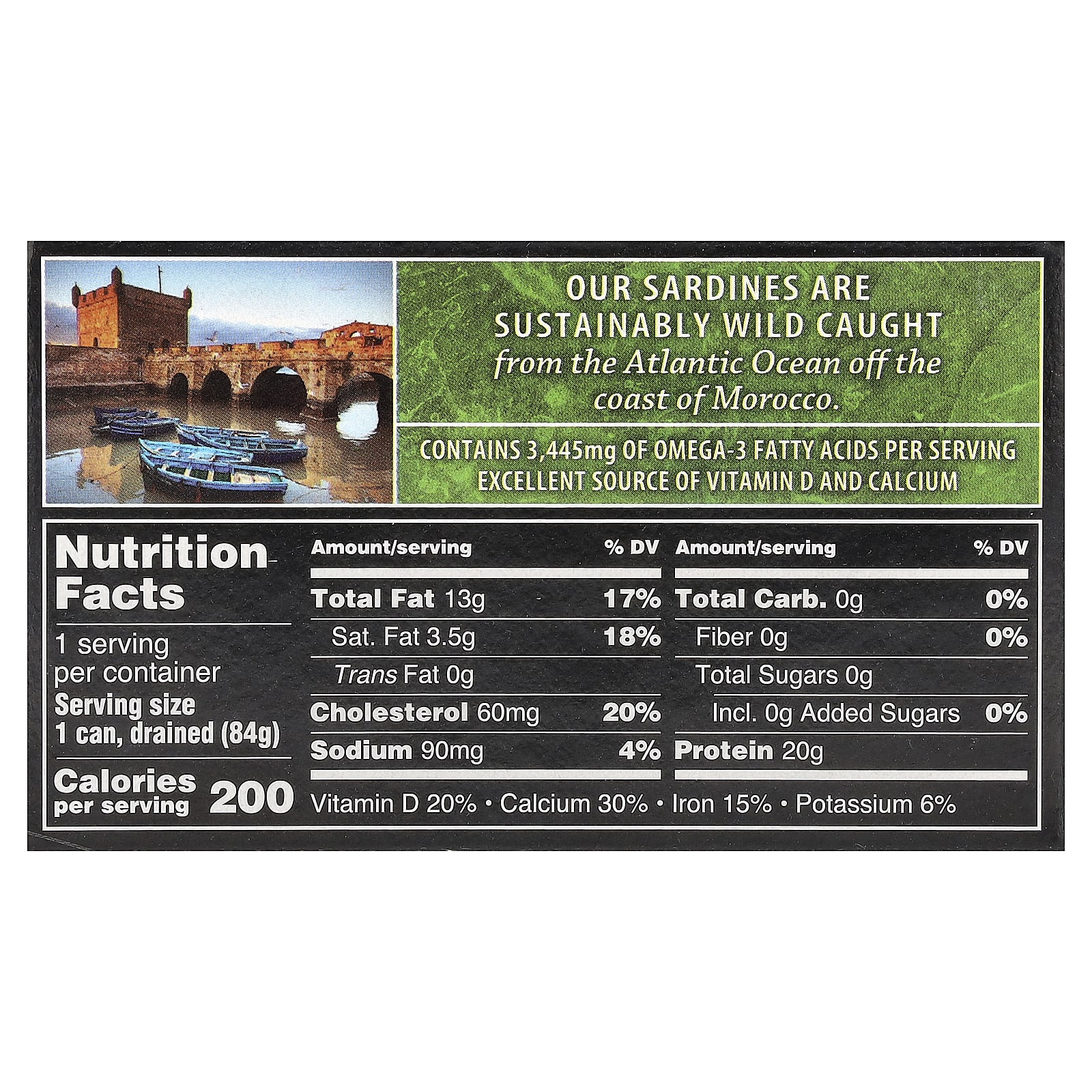 Nossas sardinhas são silvestres, pescadas de forma sustentável no Oceano Atlântico, na costa do Marrocos.