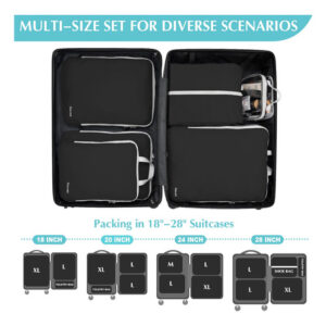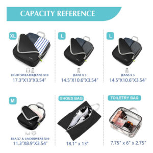 Inclui: 1x GG: 17,3 x 13 x 3,54 polegadas, 2 x L: 14,5 x 10,6 x 3,54 polegadas, 1 x M: 11,3 x 8,9 x 3,54 polegadas, 1 x bolsa de sapatos: 18,1 x 13 polegadas, 1 x bolsa de higiene transparente aprovada pela TSA: 7,75 x 6 x 2,75 polegadas