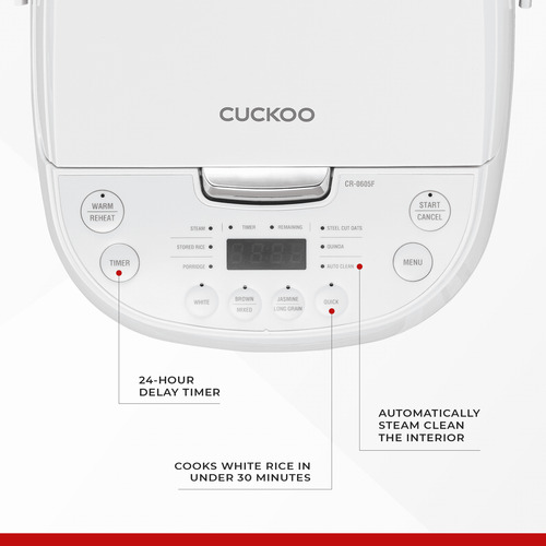 BW5EXP Explore a versatilidade do CUCKOO com a panela de arroz Micom CR-0605F de 6 xícaras! Como líder do setor e marca coreana confiável, a CUCKOO visa fornecer utensílios de cozinha e produtos domésticos de alta qualidade. Experimente cozinhar de forma fácil com nossa panela de arroz Micom, que oferece uma infinidade de opções de cozimento a vapor. Características principais: Cozinha multifuncional: com 10 opções para escolher, incluindo arroz branco e jasmim/grãos longos, modo de reaquecimento e aquecimento, cozinhar é conveniente com este dispositivo multifuncional. Capacidade de cozimento de 12 xícaras: a panela de arroz de 6 xícaras (12 xícaras cozidas) oferece o tamanho ideal para porções pequenas ou famílias de pequeno a médio porte. Tecnologia automatizada inteligente: inclui várias funções automáticas, incluindo um modo de manter aquecido, no qual mantém o arroz cozido na temperatura de servir sem cozinhar demais. Construção de alta qualidade: Incluído com uma panela interna antiaderente e controles digitais fáceis de aprender, você cozinhará com confiança em pouco tempo! Limpeza sem complicações: a panela interna antiaderente removível, a tampa interna removível e o modo de limpeza automática facilitam a limpeza e a manutenção. Atualize sua cozinha com a tecnologia premium da CUCKOO hoje e experimente a grandeza culinária!