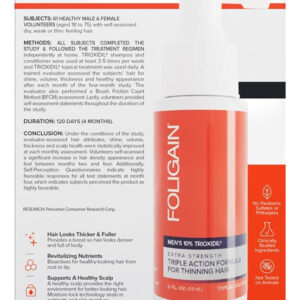 Fórmula volumizante completa Foligain Triple Action para cabelos ralos e cuidados com o cabelo para homens, 2 ml — Fórmula capilar sem parabenos e sulfatos para homens: a fórmula completa Foligain Triple Action é feita com nossa mistura mais potente de 10% de trioxidil, que atinge o cabelo da raiz às pontas para dar uma aparência de maior densidade, plenitude e vitalidade juvenil. – Fórmula volumizante fácil de usar: aplique 4 sprays em o couro cabeludo duas vezes por dia diretamente na área de queda ou queda de cabelo. Deixe no couro cabeludo por 4 (ou mais) horas e depois lave. – Fórmula hidratante para cabelo: a tecnologia de microemulsão Liposphere infunde cabelo e couro cabeludo com nosso exclusivo complexo de 10% de trioxidil. – Fórmula avançada de biotina para cabelo: nossa fórmula rejuvenescedora para cabelos também contém nutrientes importantes para o cabelo, como biotina, e é reforçada por tricogênio, procapil, peptídeos de cobre e extrato de broto de ervilha para uma solução verdadeiramente abrangente. – Tamanho e outros detalhes: Esta fórmula revitalizante para o cabelo vem em 2 Fl. Garrafa de oz.