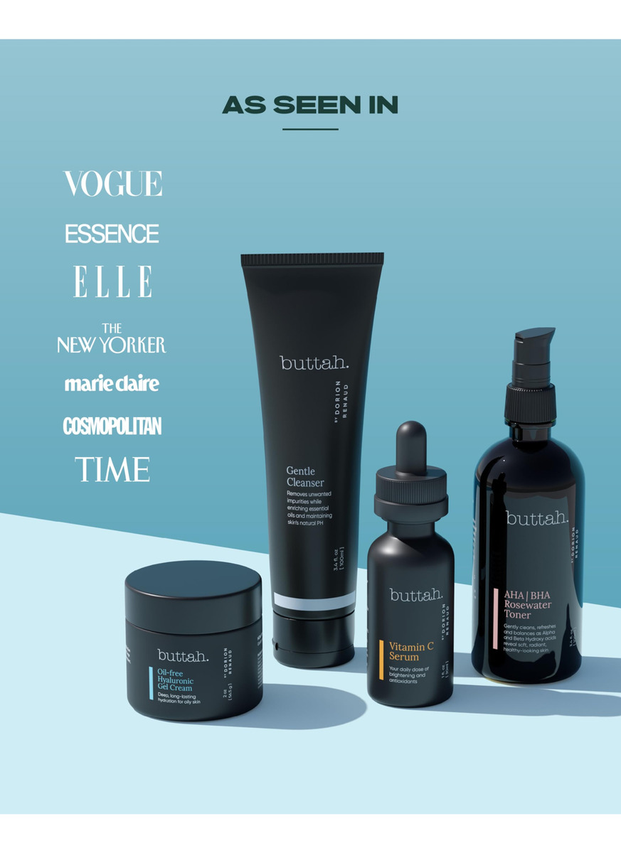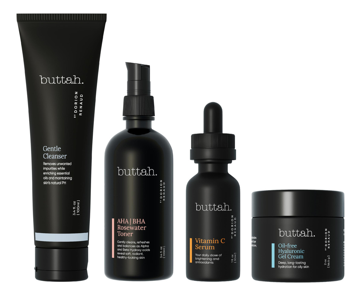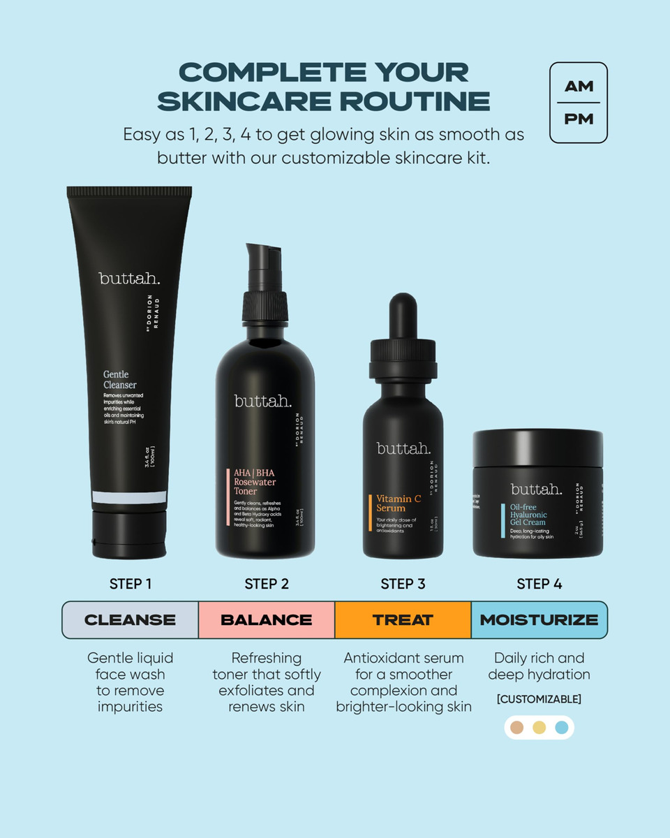 Fácil como 1, 2, 3, 4 para obter uma pele brilhante e macia como manteiga com nosso kit de cuidados com a pele personalizável. Produtos desenvolvidos para limpar, esfoliar, proteger e hidratar suavemente diariamente para revelar sua melhor pele. Formulado especialmente para peles ricas em melanina e todos os tipos de pele. Basta selecionar seu hidratante — para deixar a pele brilhante e macia. — KIT SUPREME SKINCARE Nosso kit Supreme de produtos HERO funciona em conjunto para limpar, tonificar, esfoliar, proteger e hidratar a pele diariamente. O conjunto completo é o conjunto perfeito de cuidados com a pele para homens e mulheres. – Limpeza suave e eficaz – Nosso limpador diário em gel remove suavemente a sujeira, o óleo, os detritos e as células superficiais que embotam o brilho para uma pele mais lisa, brilhante e saudável, sem retirar a pele de seus óleos naturais. – O tônico multifuncional hidrata, limpa e acalma a pele – Após a limpeza, sature um algodão redondo com nosso tônico refrescante e passe pelo rosto, pescoço e decote, evitando a área dos olhos, e desfrute dos aromas suaves da rosa de Damasco e da lavanda calmante. Este tônico facial deixa sua pele fresca, energizada e pronta para absorver mais benefícios do Buttah. Nosso tônico de rosa damasco é perfeito para sua rotina matinal e noturna. – ILUMINE E SUAVIZE COM VITAMINA C – Chamado de Magic in a Bottle da nossa família Buttah, este sérum é perfeito para peles ricas em melanina. Este sérum iluminador combate ressecamento, oleosidade excessiva, imperfeições, hiperpigmentação, manchas escuras e inflamações para uma pele brilhante, vibrante e verdadeiramente saudável. – LEVE E SEM ÓLEO PARA USO DIÁRIO – Nosso hidratante sem óleo é leve como uma pluma para manter você suave, macia e hidratada sem deixar uma sensação de peso ou oleosidade. Adicione nosso hidratante à base de água à sua rotina de cuidados com a pele para deixar sua pele macia e macia como o Buttah após apenas um uso!