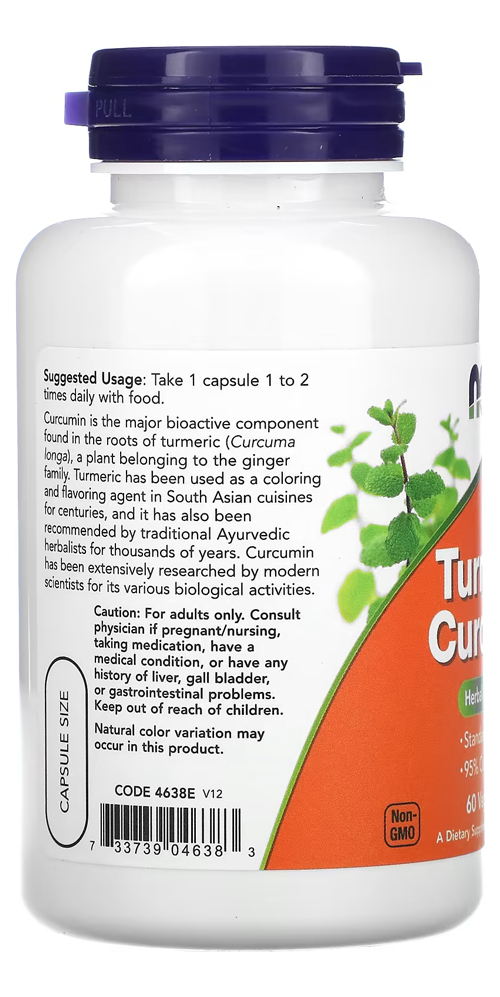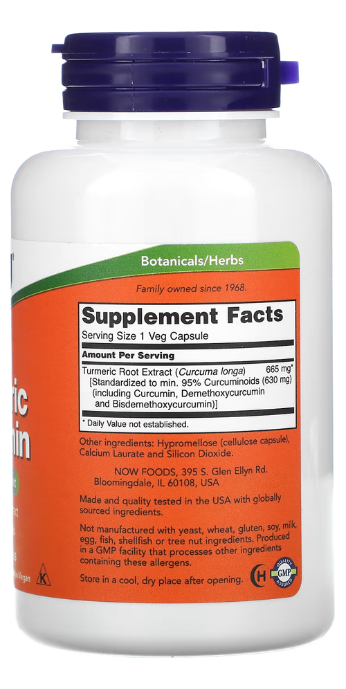 Curcumina Açafrão da India 665mg Now Foods 60 Veg caps A curcumina é o principal componente bioativo encontrado nas raízes da cúrcuma (Curcuma longa), uma planta pertencente à família do gengibre. A cúrcuma tem sido usada como um agente corante e aromatizante na culinária do sul da Ásia há séculos e também é recomendada por herboristas ayurvédicos tradicionais há milhares de anos. A curcumina foi amplamente pesquisada por cientistas modernos por suas várias atividades biológicas. Outros Ingredientes: Hipromelose (cápsula de celulose), Laurato de Cálcio e Dióxido de Silício. Não contém fermento, trigo, glúten, soja, leite, ovo, peixe, marisco ou ingredientes de nozes. Produzido em uma instalação de GMP que processa outros ingredientes contendo esses alérgenos. Apenas para adultos. Consulte um profissional se estiver grávida / amamentando ou se tiver um problema. VALIDADE LONGA.