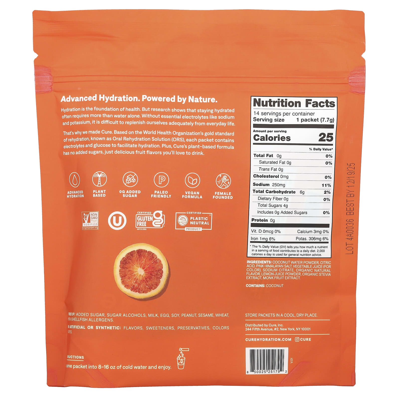 Cure Hydration Mistura para Bebida de Eletrólitos Laranja Sanguínea 14 Embalagens 77 g (027 oz) Cada