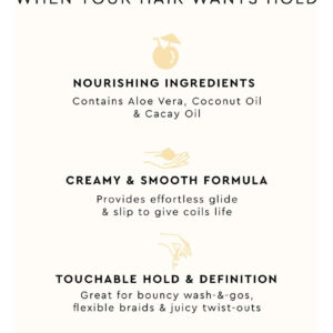 Um gel cremoso e macio com aloe vera, óleo de coco e óleo de cacaia para definir e nutrir os cachos com uma fixação média, ótimo para lavar e levar. – Oferece cachos definidos, elásticos e suculentos que buscam uma fixação média – Um favorito para lavar e lavar – Nutre com aloe vera, óleo de coco e óleo de cacaia. – Oferece fixação palpável – Fragrância: Tracee a escolheu para ficar limpa e não exagerada energizando. As notas são uma doce essência floral de Neroli, Rosa e Patchouli.