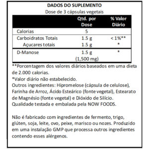 Fácil de Incorporar: As cápsulas vegetais são facilmente incorporadas em sua rotina, independentemente de seu estilo de vida. Seja você uma pessoa que está sempre em movimento ou alguém que passa mais tempo em casa, a D-manose 500mg da é o complemento perfeito para sua alimentação.;