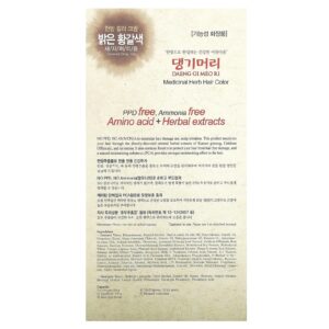 Sem PPD e sem amônia para minimizar os danos ao cabelo e a irritação do couro cabeludo. Esse produto nutre seus cabelos através da decocção direta de extratos de ervas orientais de ginseng coreano, Cnidium officinale e artemísia. Também contém queratina para proteger seus cabelos dos danos da tintura, além de uma substância hidratante natural (PCA) que proporciona um efeito hidratante mais forte aos cabelos.