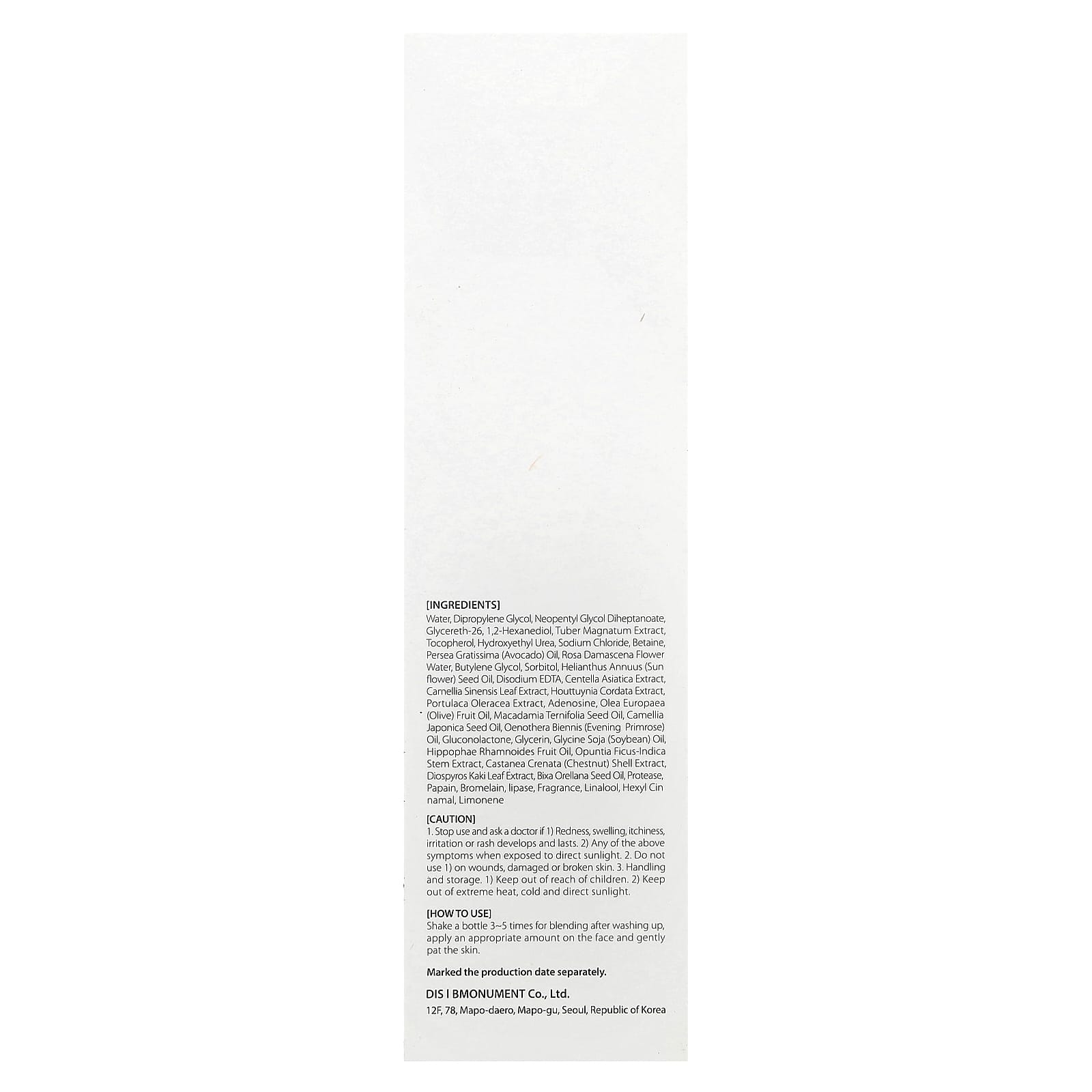 Água, dimetildietilenoglicol, neopentyl glycol diheptanoate, glicerina-26,1,2-hexanodiol, extrato de tubérculo magnato, tocoferol, hydroxyethyl urea, cloreto de sódio, betaína, óleo de Persea gratissima (abacate), água da flor de Rosa damascena, butilenoglicol, sorbitol, óleo da semente de Helianthus annuus (flor do sol), edetato dissódico, extrato de Centella asiatica, extrato da folha de Camellia sinensis, extrato de Houttuynia cordata, extrato de Portulaca oleracea, adenosina, óleo da fruta de Olea europaea (azeitona), óleo da semente de Macadamia ternifolia, óleo de semente de Camellia japonica, óleo de Oenothera biennis (prímula), gluconolactone, glicerina, óleo de Glycine soja (soja), óleo da fruta de Hippophae rhamnoides, extrato do caule de opuntia ficus-indica, extrato da casca de castanea crenata (castanha), extrato da folha de Diospyros kaki, óleo da semente de bixa orellana, protéase, papaína, bromelaína, lipase, fragrância, linalol, hexyl cinnamal, limoneno.