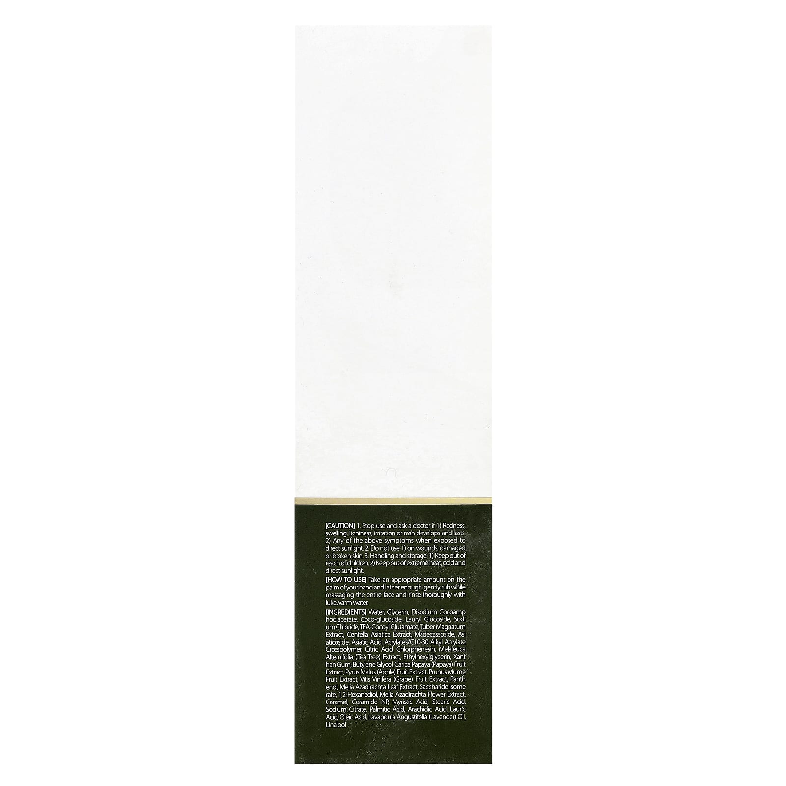 Água, glicerina, disodium cocoamphodiacetate, coco-glucoside, lauryl glucoside, cloreto de sódio, glutamato de coco-chá, extrato de tubérculo magnato, extrato de Centella asiatica, madecassoside, asiaticoside, asiatic acid, acrylates/c10-30 alkyl acrylate crosspolymer, ácido cítrico, clorfenesina, extrato de Melaleuca alternifolia (melaleuca), ethylhexylglycerin, goma xantana, butilenoglicol, extrato da fruta Carica papaya (mamão), extrato da fruta de Pyrus malus (maçã), extrato da fruta de Prunus mume, extrato da fruta Vitis vinifera (uva), pantenol, extrato da folha de Melia azadirachta, saccharide isomerate, 1,2-hexanediol, extrato da flor de Melia azadirachta, caramelo, ceramide NP, ácido mirístico, ácido esteárico, citrato de sódio, ácido palmítico, ácido eicosanoico, ácido láurico, ácido oleico, óleo de Lavandula angustifolia (lavanda), linalol.